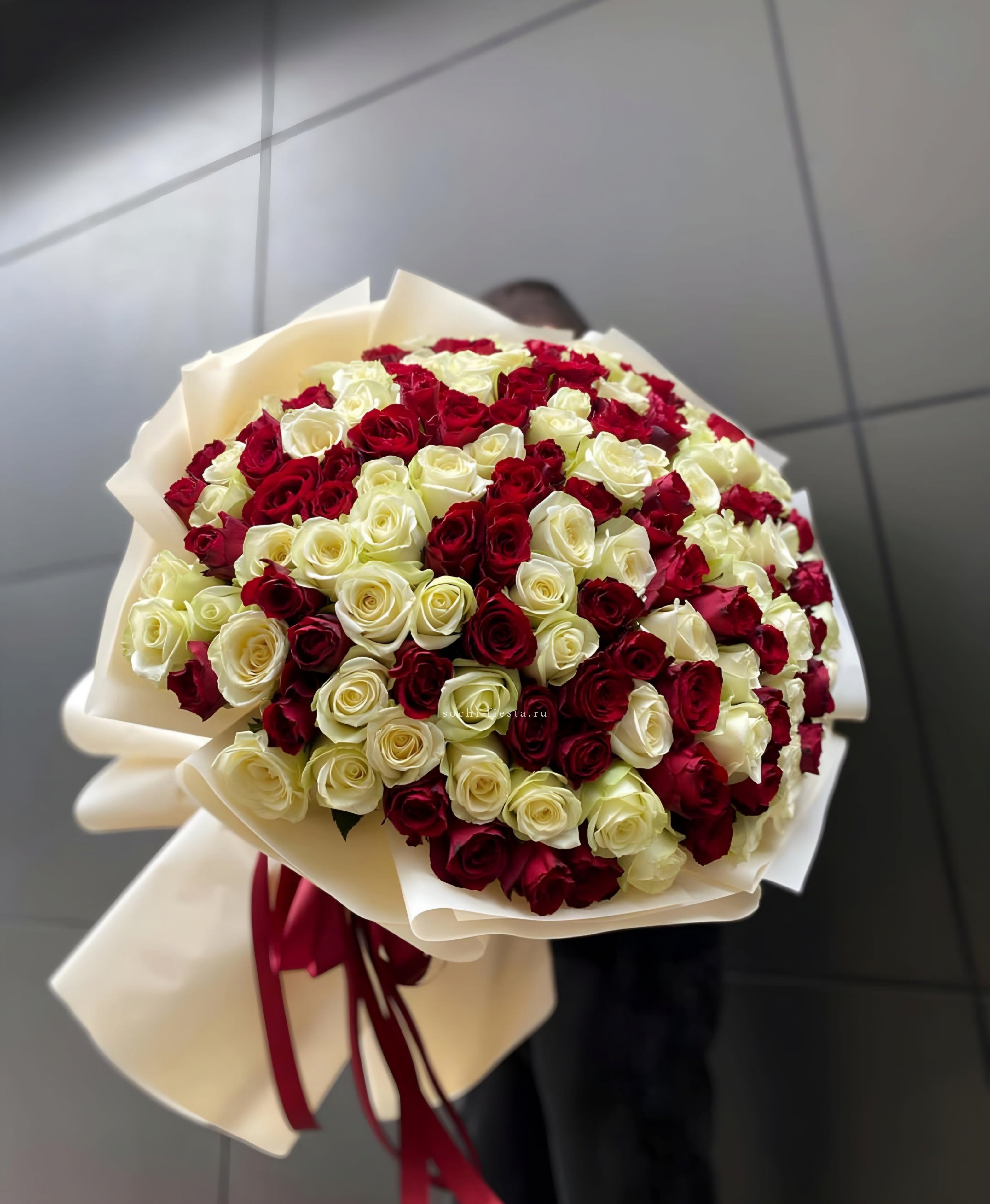 Красные и белые розы выложены в форме сердца — графичная композиция из ста одного бутона. Контрастное сочетание создаёт чёткий рисунок.