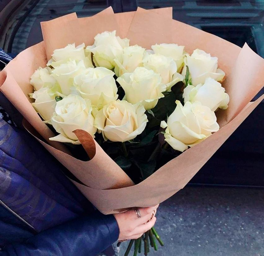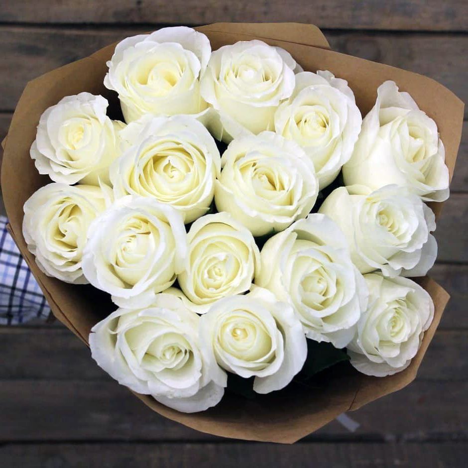 Пятнадцать белоснежных роз собраны в аккуратную форму с ровным силуэтом. Композиция сохраняет свежесть и держит структуру благодаря продуманному размещению бутонов в цилиндре.