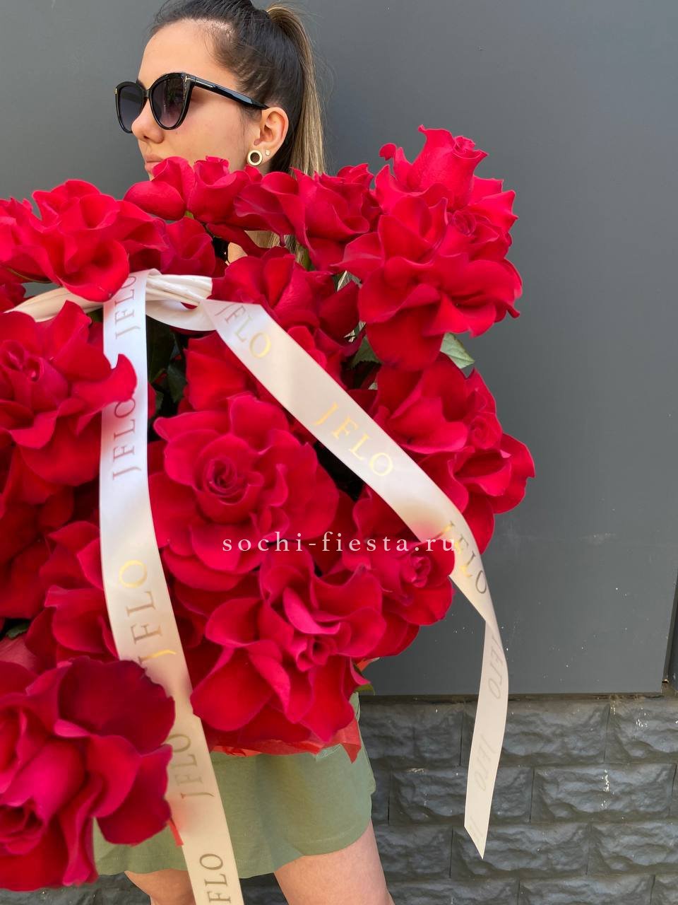 101 красная роза, эвкалипт, лента, оформление.