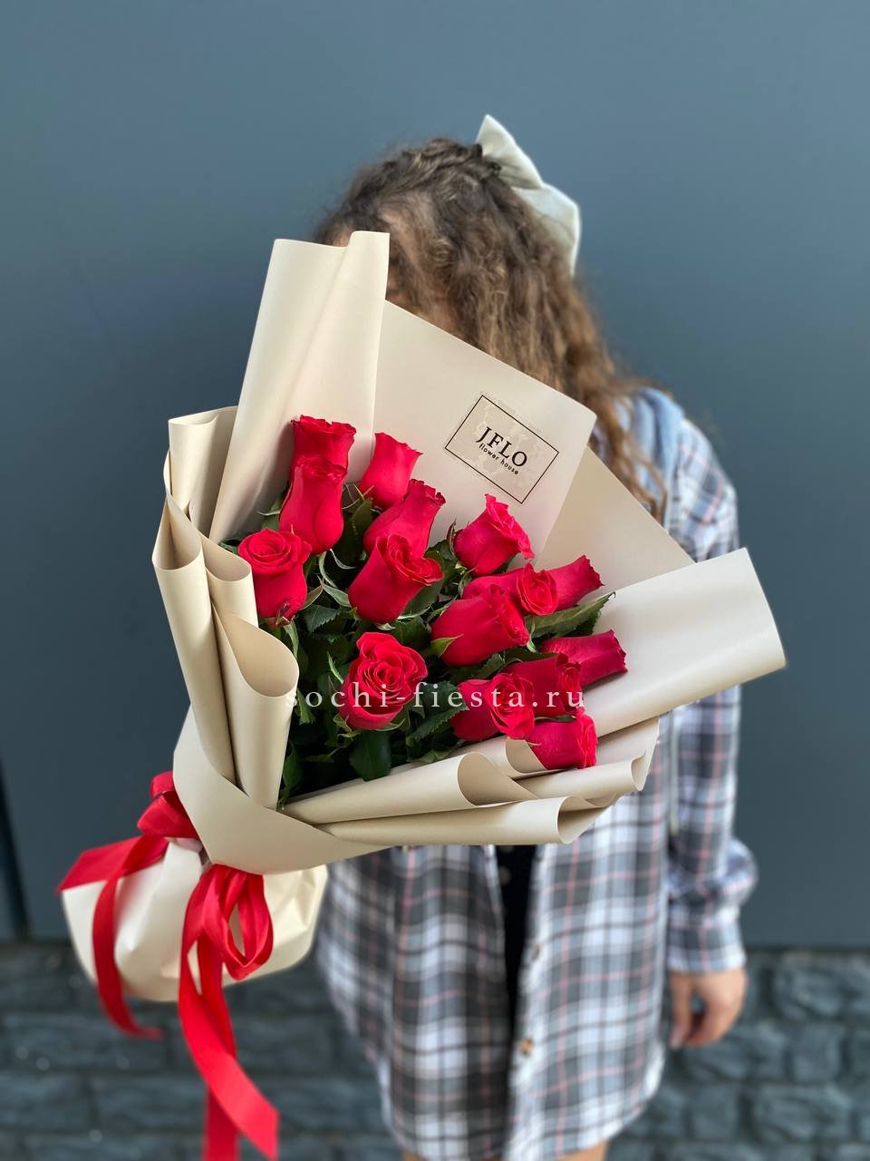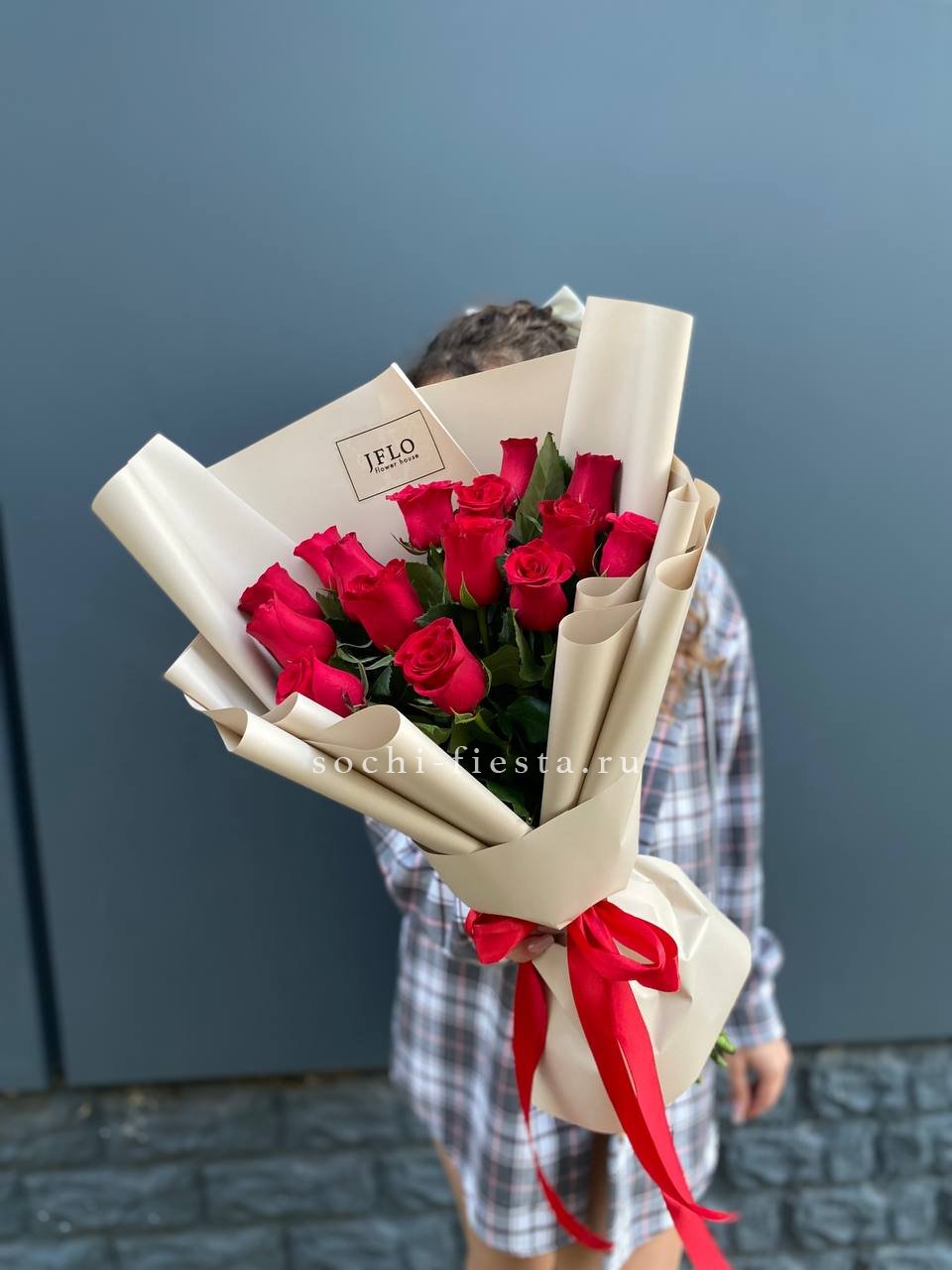 Красные розы в количестве девятнадцати стеблей, оформленные в матовую крафт-бумагу. Минималистичная обертка не отвлекает от насыщенного цвета и упругих бутонов. Простое решение с четким характером.