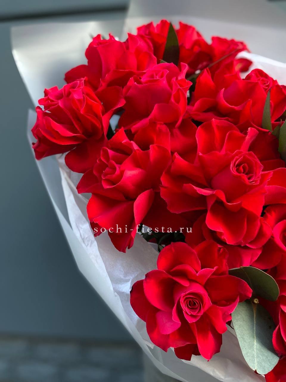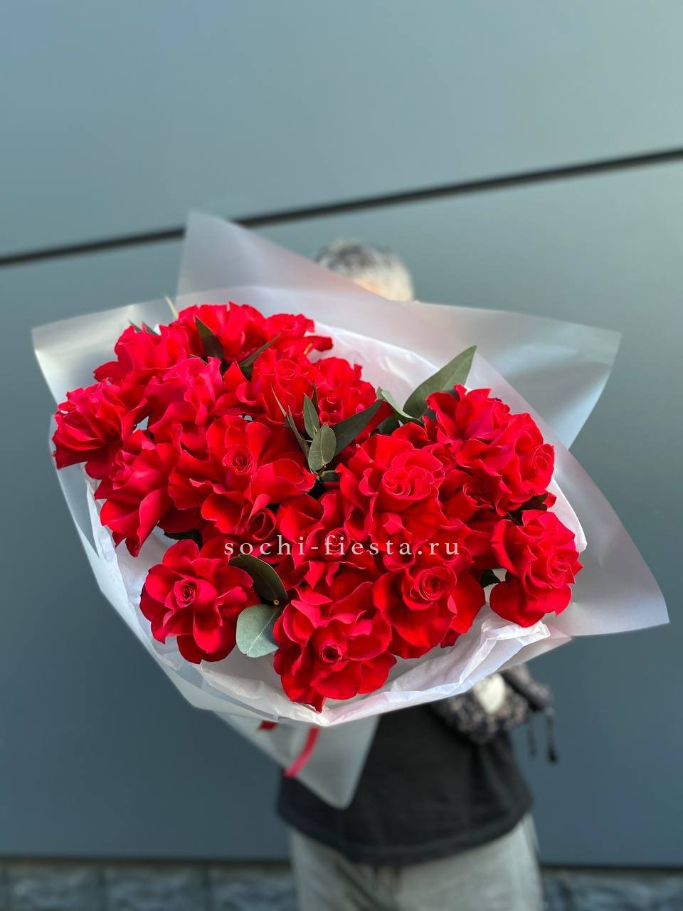 Классическая красная гамма в масштабной подаче. Тридцать семь стеблей формируют округлую композицию с четким силуэтом. Букет занимает пространство и сразу привлекает внимание.