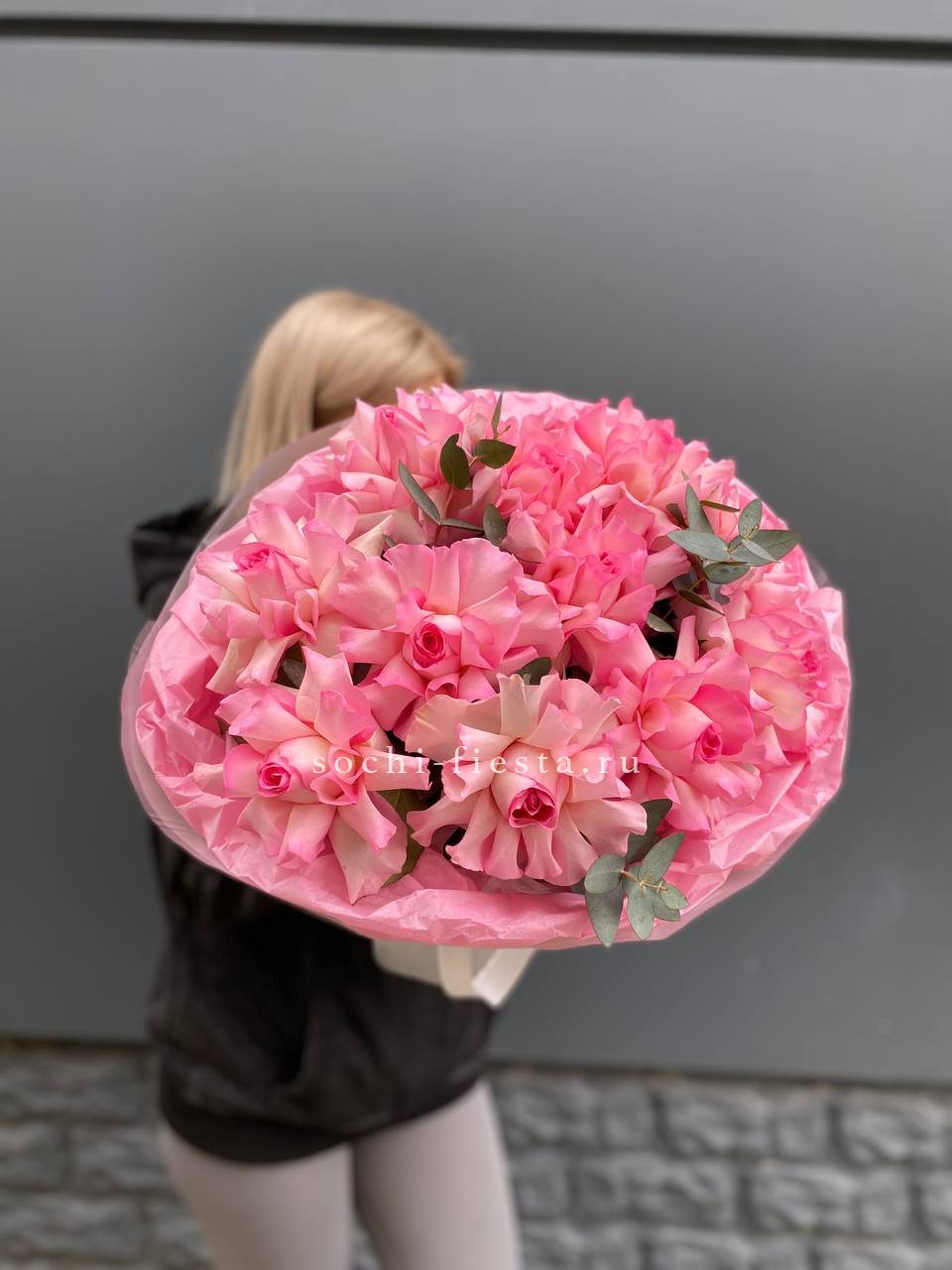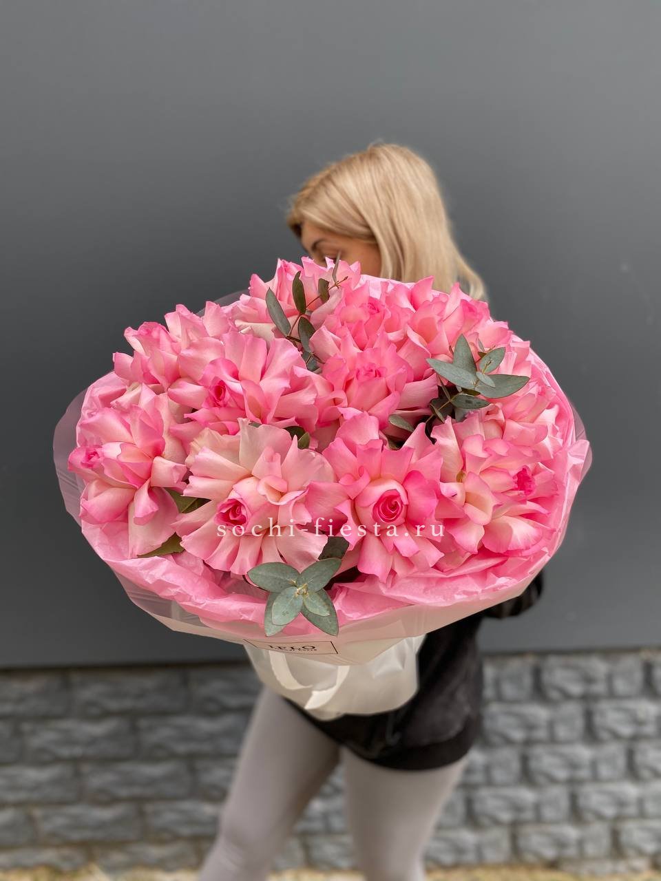 Семнадцать вывернутых роз открывают фактурную глубину лепестков и создают объемную композицию. Каждый бутон раскрывается по-своему, а эвкалипт добавляет воздушности общей форме.
