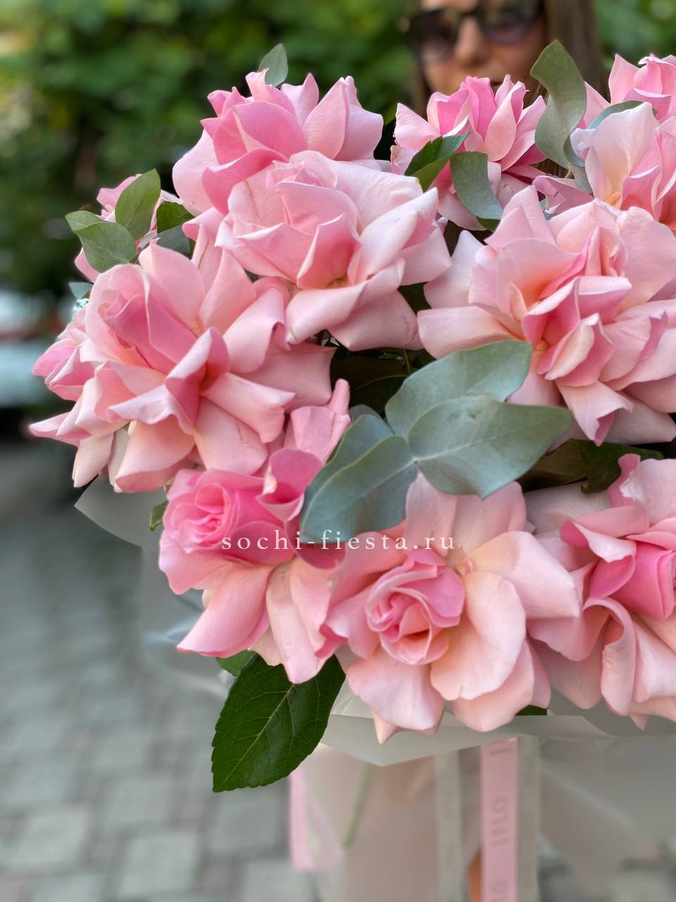 вывернутые розы - 17 шт., эвкалипт,  лента, авторская упаковка.