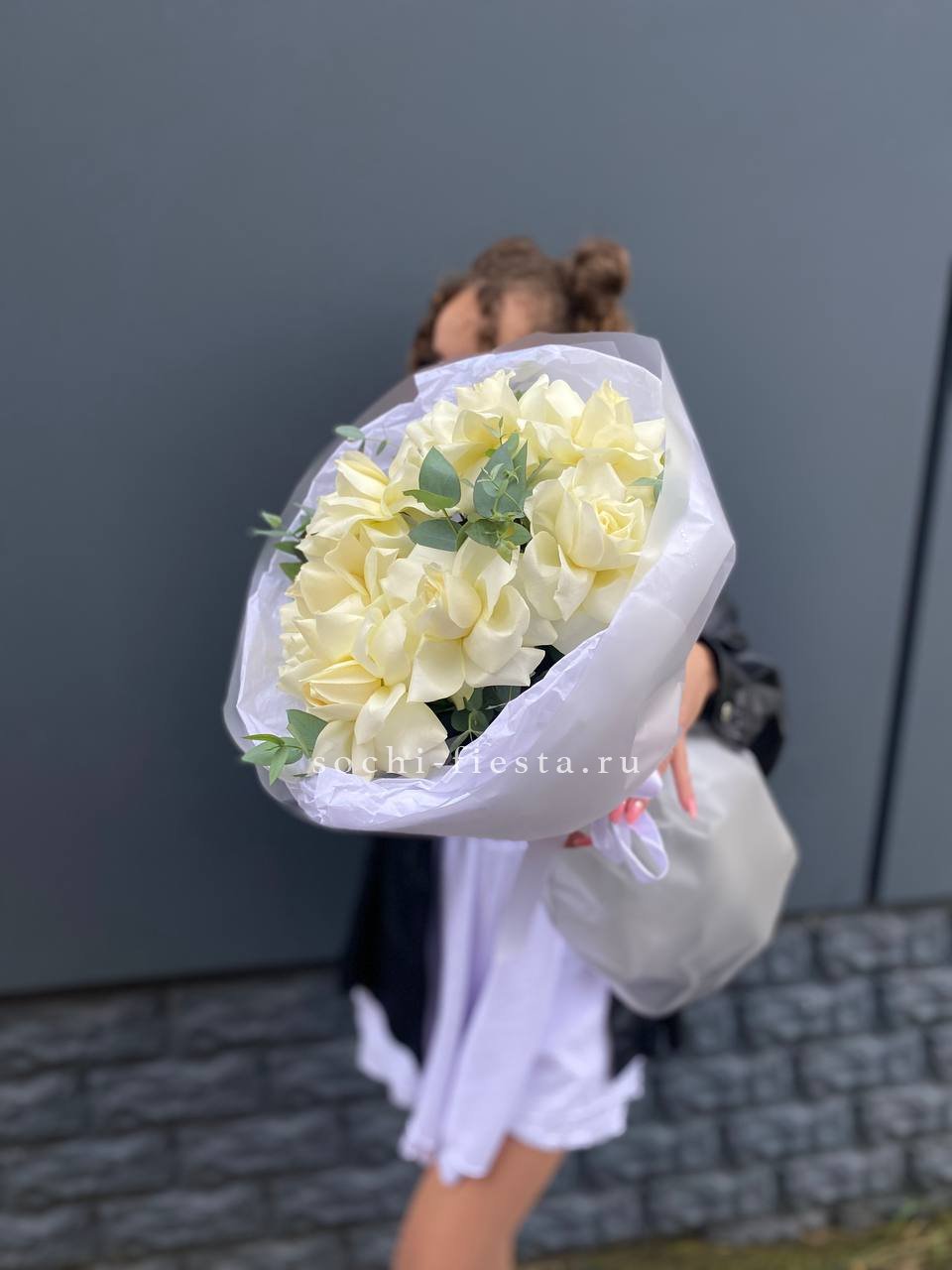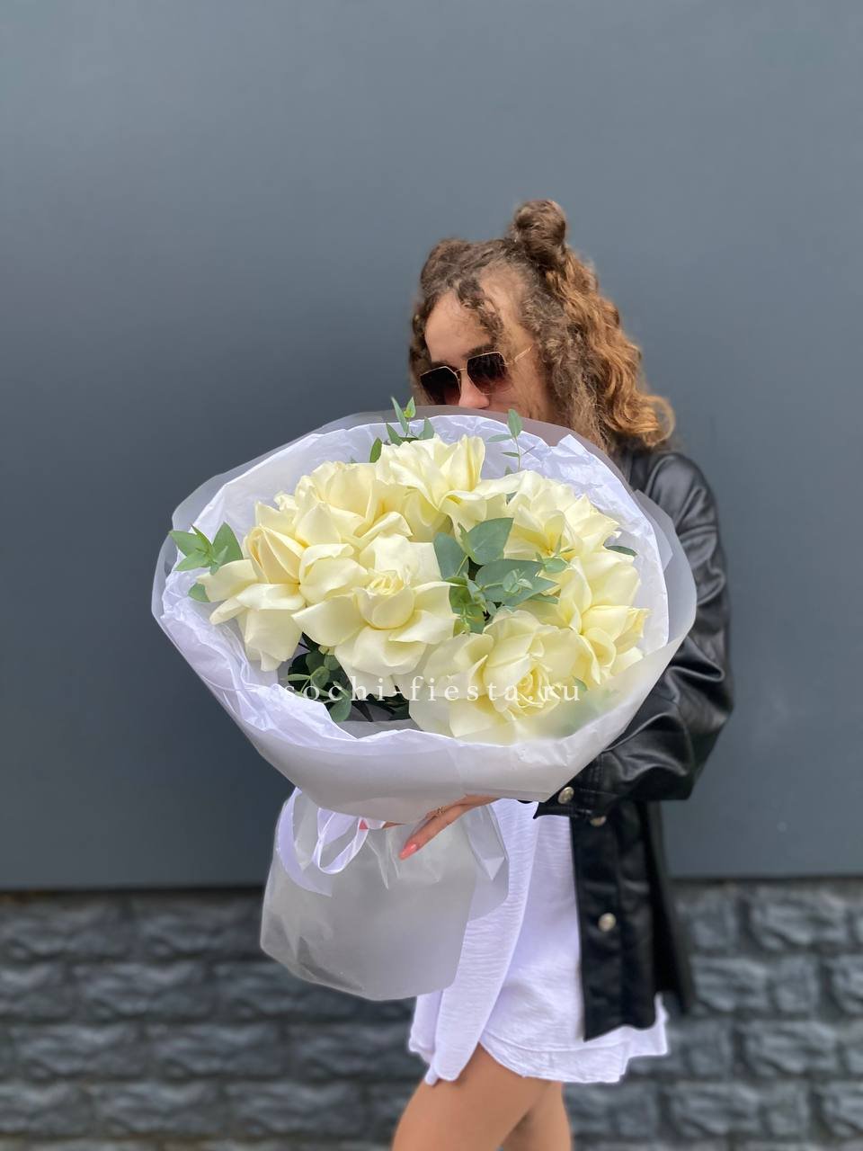 Семь вывернутых бутонов раскрываются широко и свободно, открывая слои белоснежных лепестков. Эвкалипт добавляет воздух и свежесть композиции.
