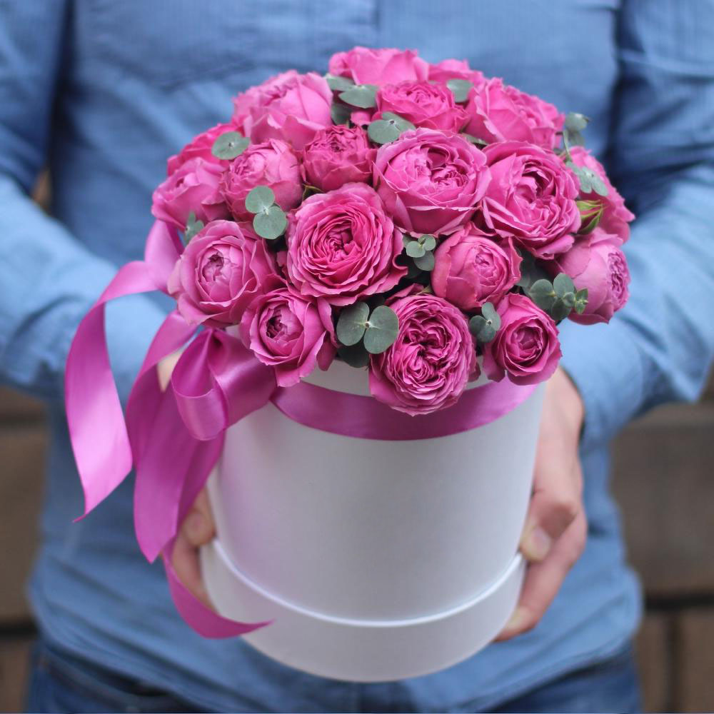 яркий букет из 11 пионовидных кустовых роз с эвкалиптом.