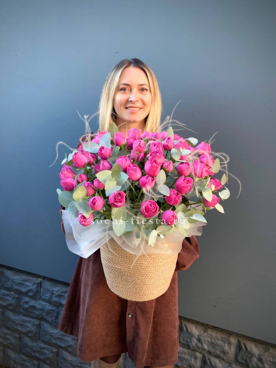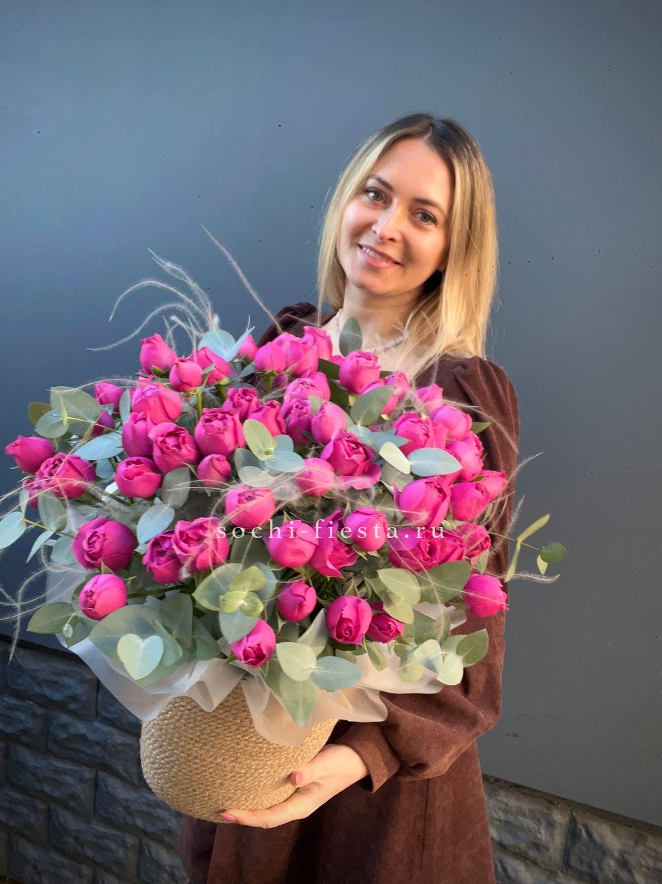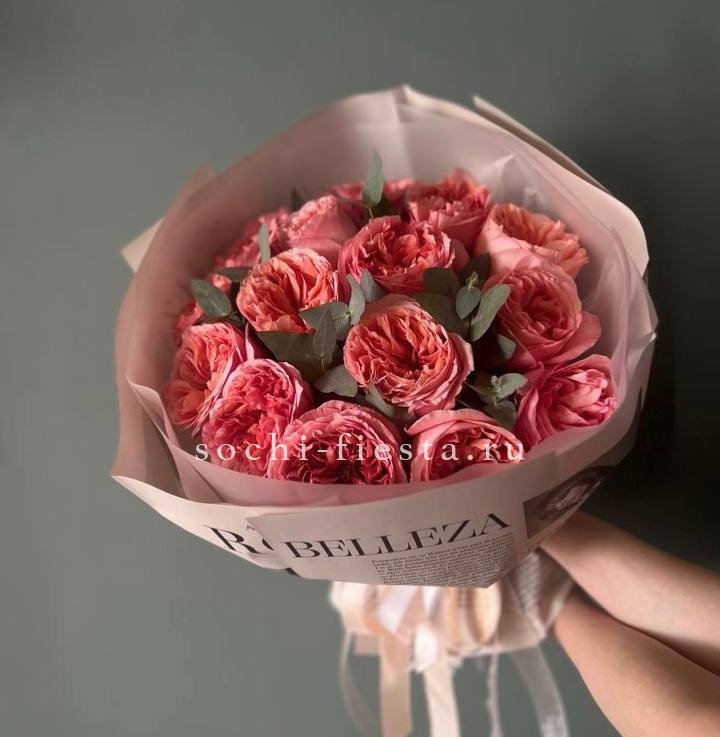 розы пионовидные 15 шт, эвкалипт, пленка, лента.