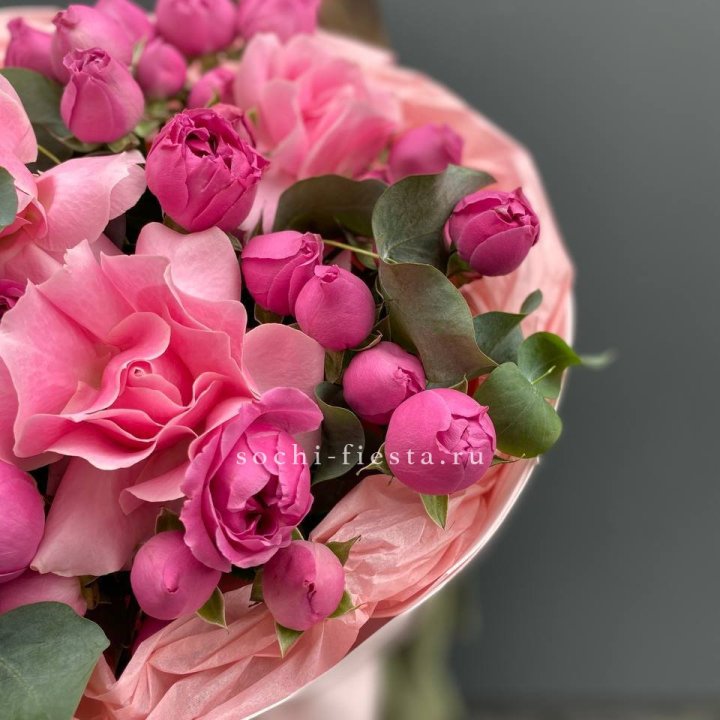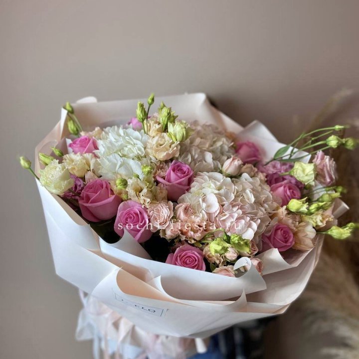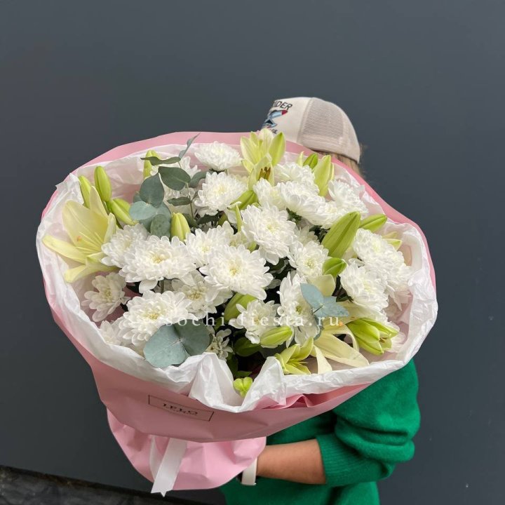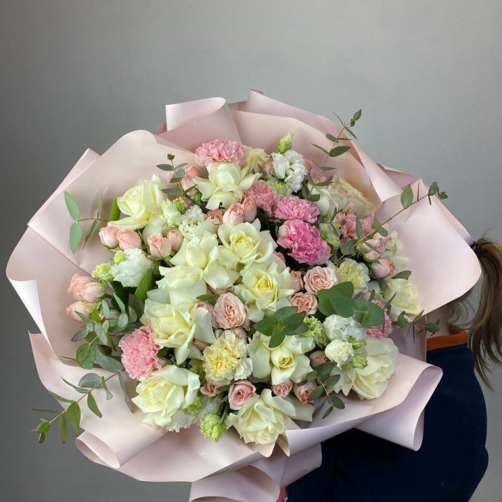 Зима и лето в Брянске — розы и хризантемы как основа. Эти виды стабильны в поставках круглый год. Флорист дополняет их сезонными акцентами: хвойные ветви зимой, открытая эустома летом. Сборный букет в любое время года выглядит живым и актуальным.