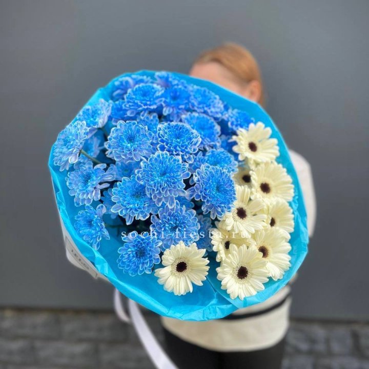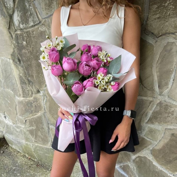Основа сборных букетов в Брянске: розы (Freedom, Mondial, Avalanche), хризантема кустовая, альстромерия, эустома, фрезия, вероника. Дополнительно — ранункулюсы в сезон, хризантема одиночная, ирис весной, тюльпаны в апреле. Состав зависит от текущей поставки и сезона. Флорист всегда предлагает то, что в лучшей форме прямо сейчас.