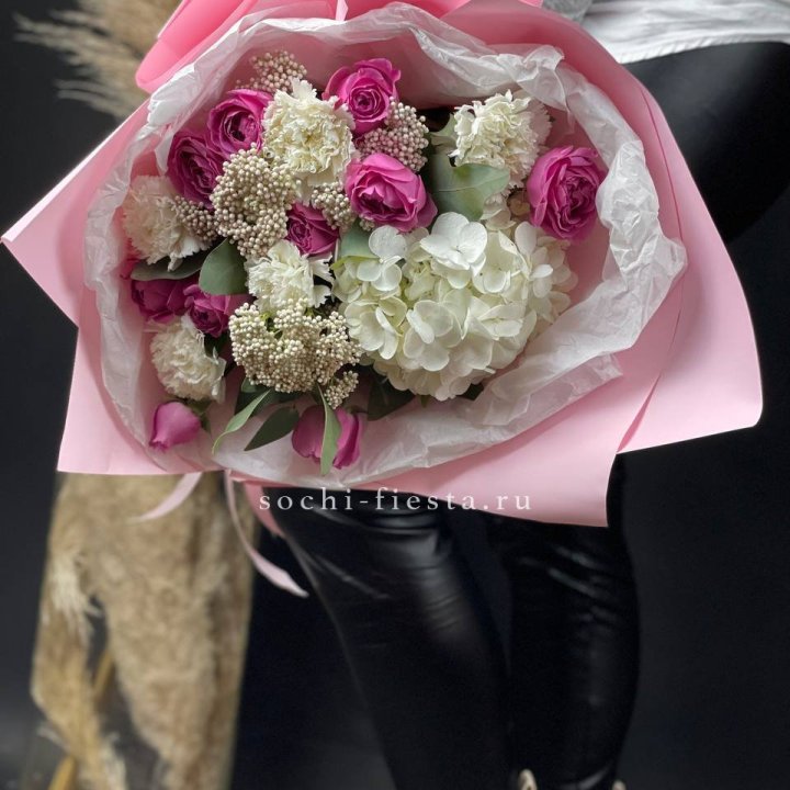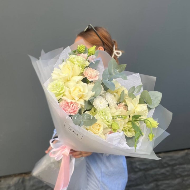 Зима и лето в Брянске — розы и хризантемы как основа. Эти виды стабильны в поставках круглый год. Флорист дополняет их сезонными акцентами: хвойные ветви зимой, открытая эустома летом. Сборный букет в любое время года выглядит живым и актуальным.