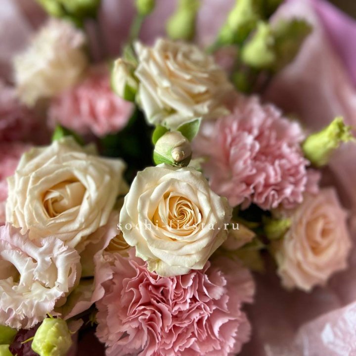 Основа сборных букетов в Брянске: розы (Freedom, Mondial, Avalanche), хризантема кустовая, альстромерия, эустома, фрезия, вероника. Дополнительно — ранункулюсы в сезон, хризантема одиночная, ирис весной, тюльпаны в апреле. Состав зависит от текущей поставки и сезона. Флорист всегда предлагает то, что в лучшей форме прямо сейчас.