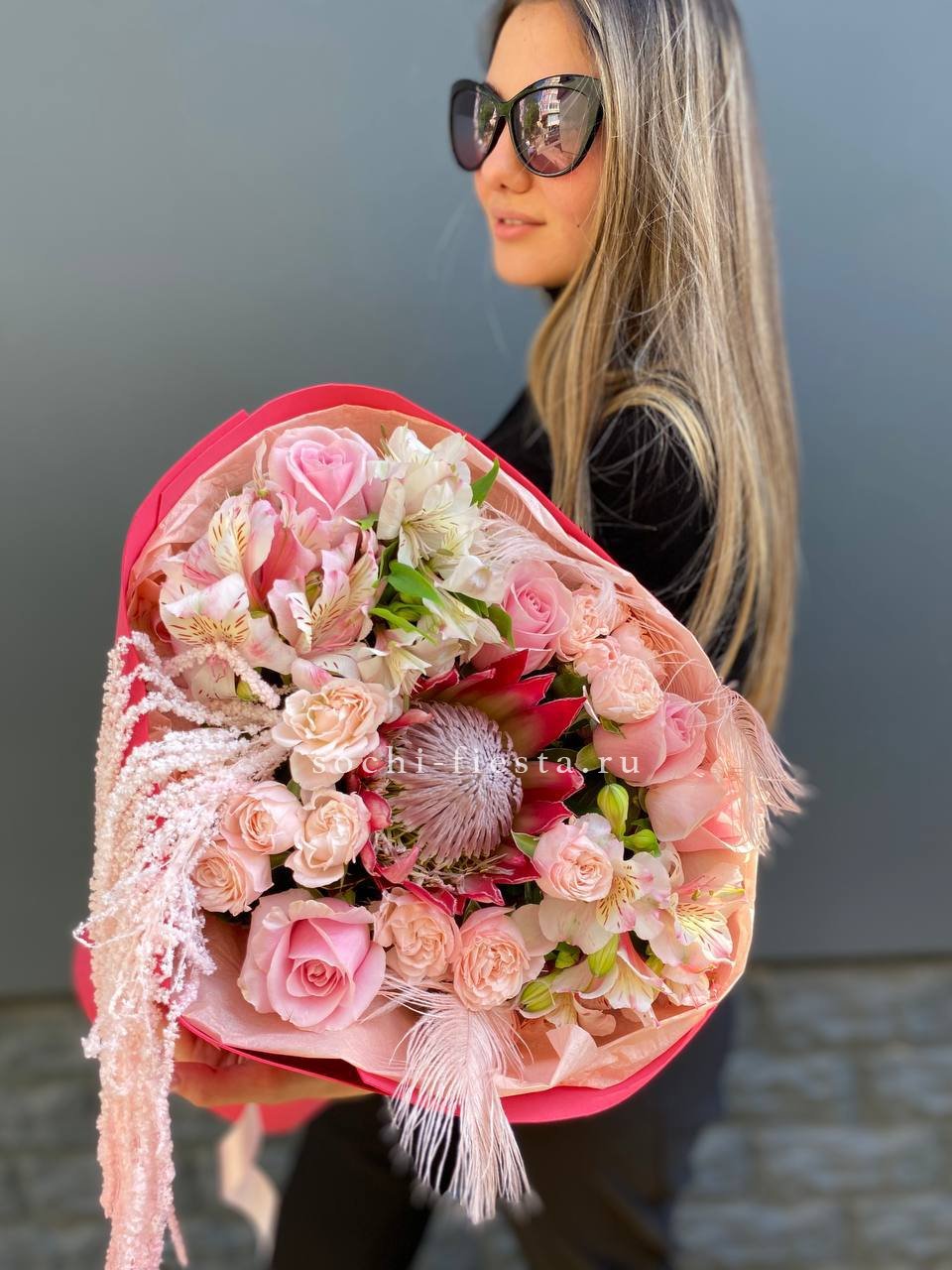 протея, кустовые розы, одноголовые розы, альстромерии, перья, амарант, лента и дизайнерская пленка.