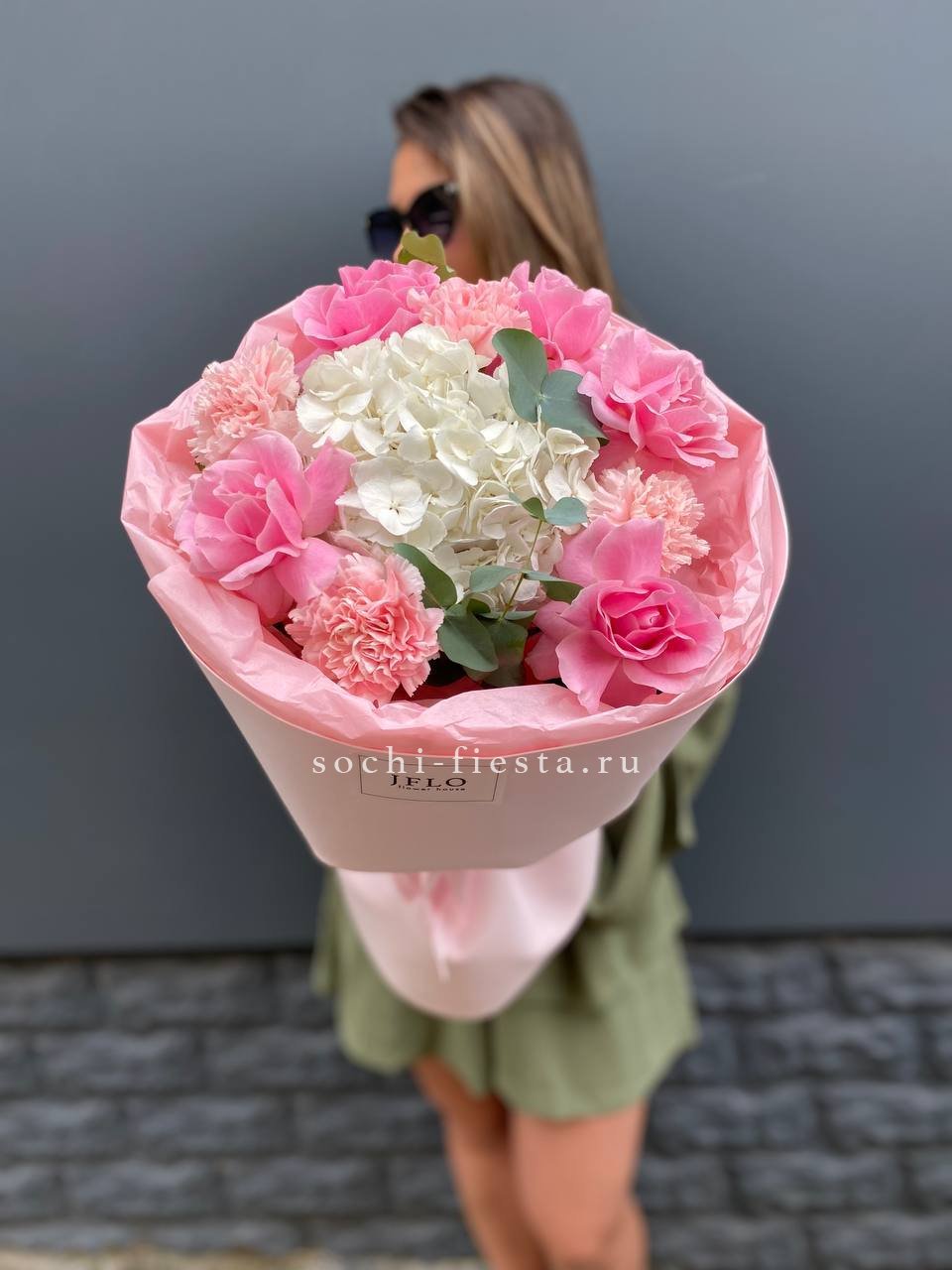 маттиола, розы, гортензия, диантусы, хризантемы , лента и дизайнерская пленка.