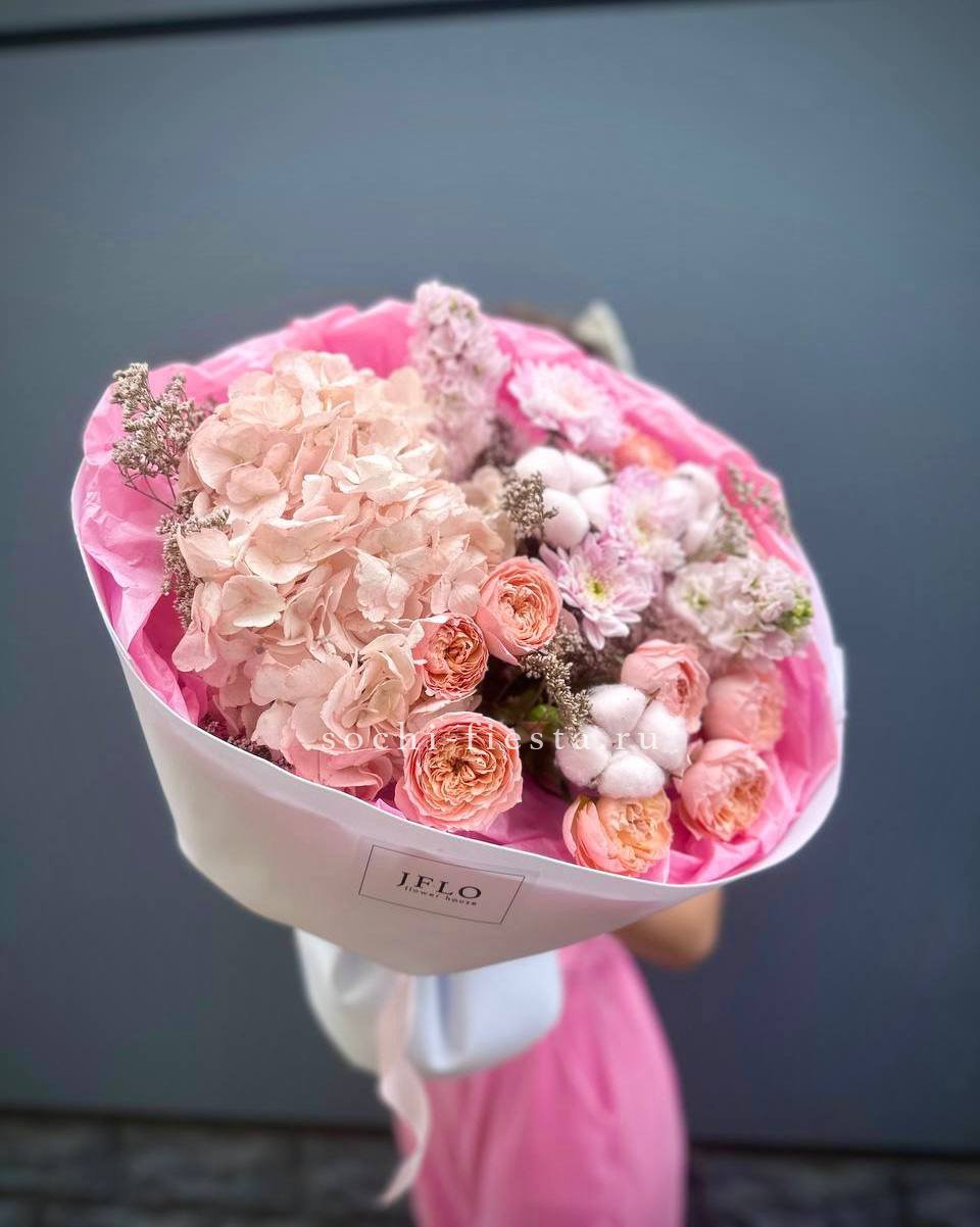 гортензия, маттиола, кустовые пионовидные розы Джульетта (аналог), хризантема кустовая, хлопок, лимониум (аналог), дизайнерская упаковка.