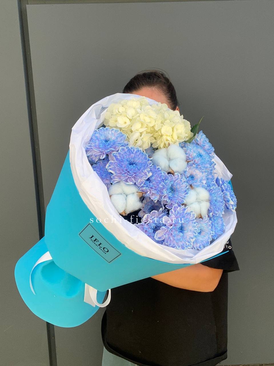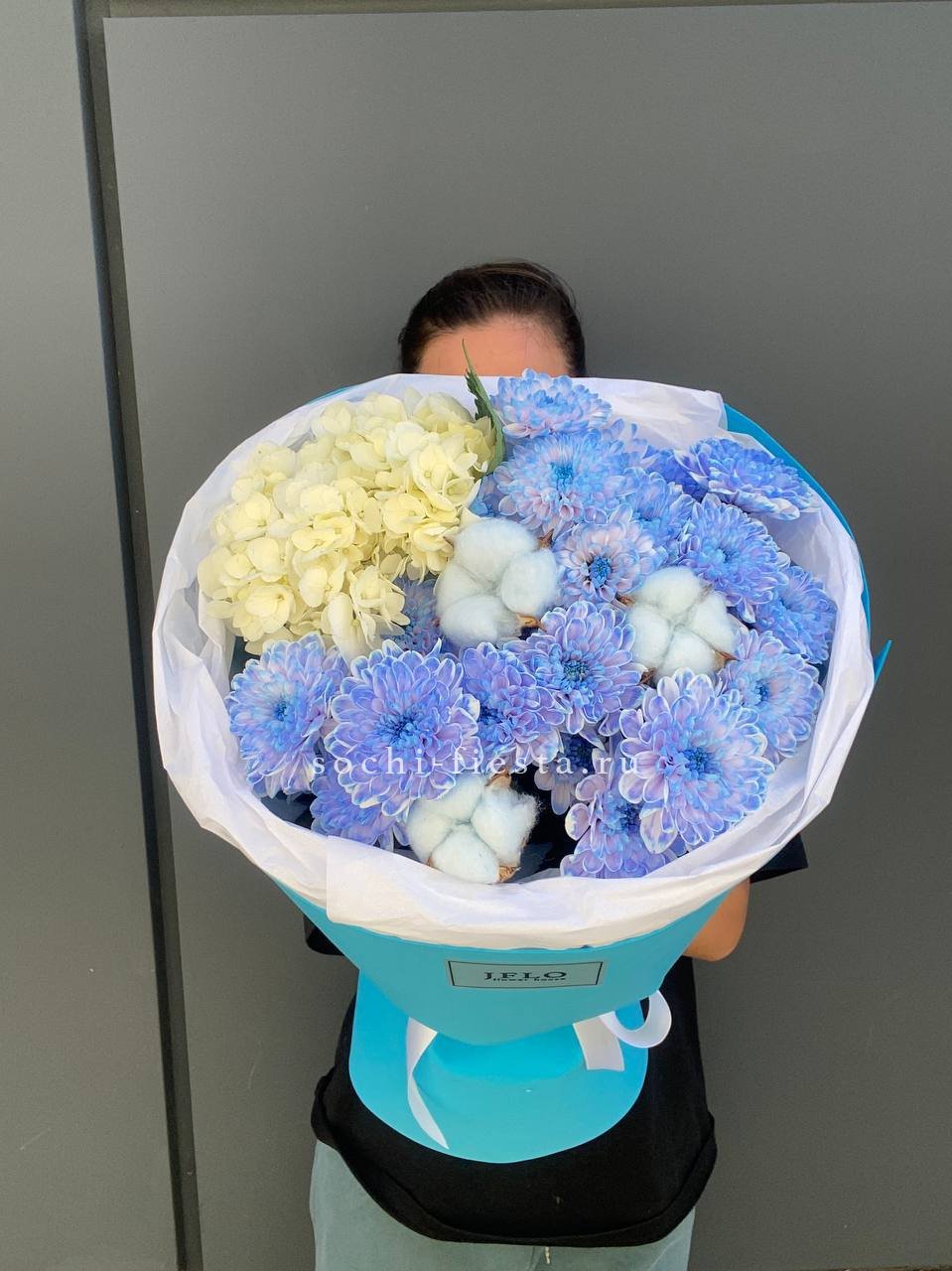 Пионовидные розы Джульетта с пышными шапками гортензии создают плотную композицию в пудровой гамме. Хлопок и лимониум добавляют воздушности, а кустовая хризантема заполняет пространство между крупными бутонами. Букет держит форму и долго сохраняет свежесть.