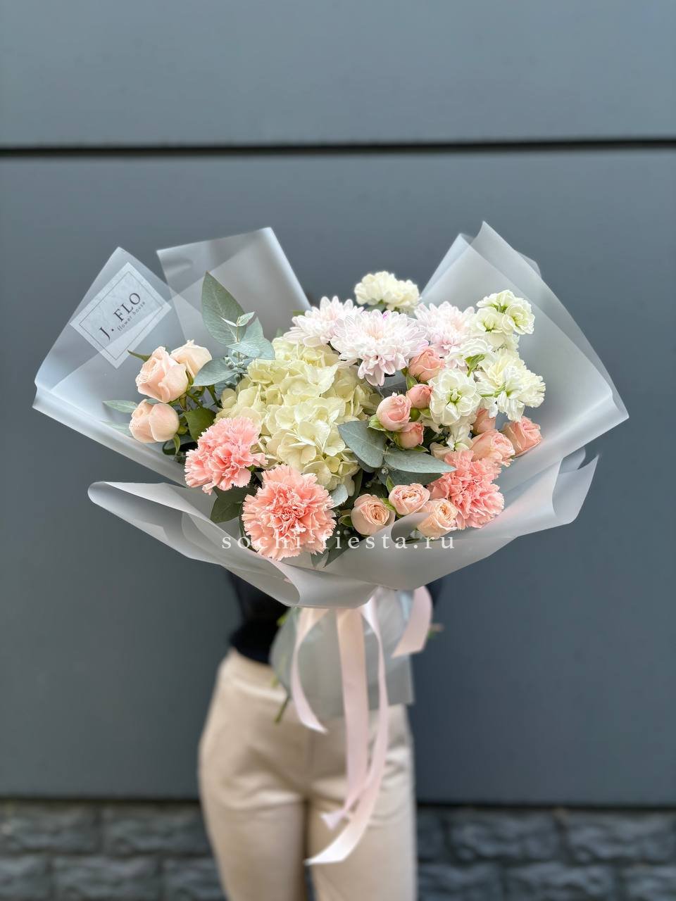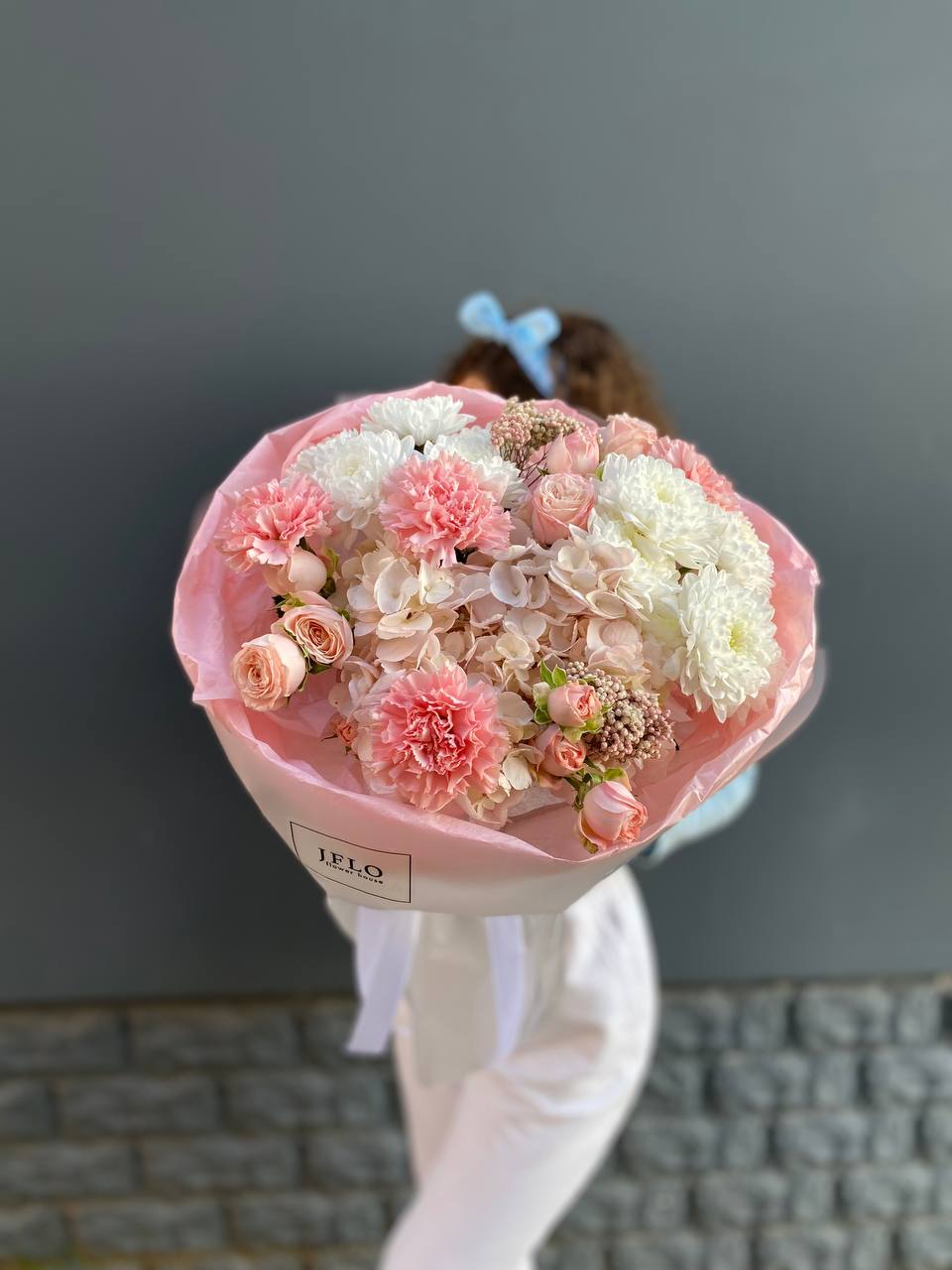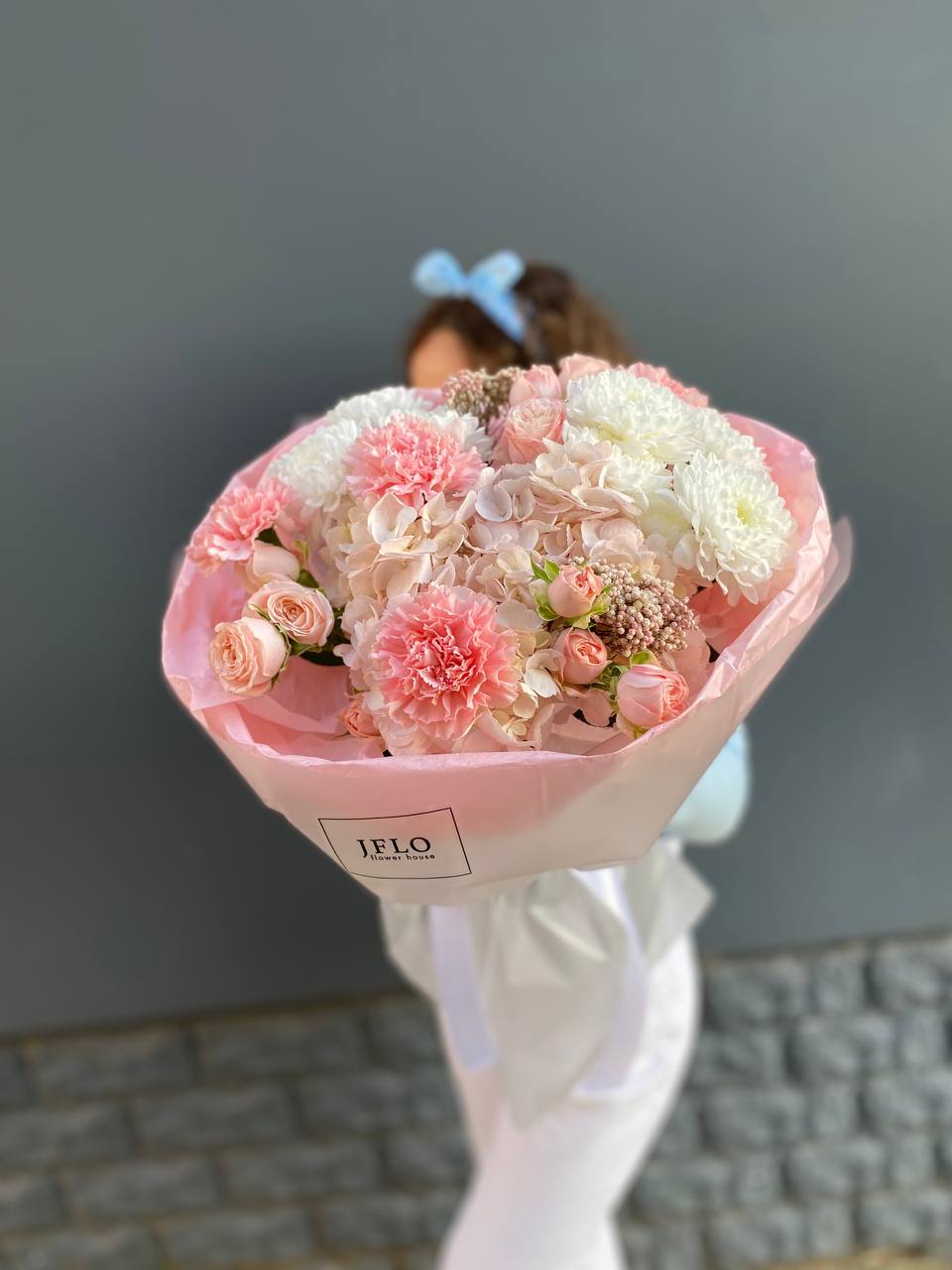 Пышные шапки гортензии создают воздушный объём, а белые розы добавляют графичности. Букет держит форму и легко размещается в любом пространстве.