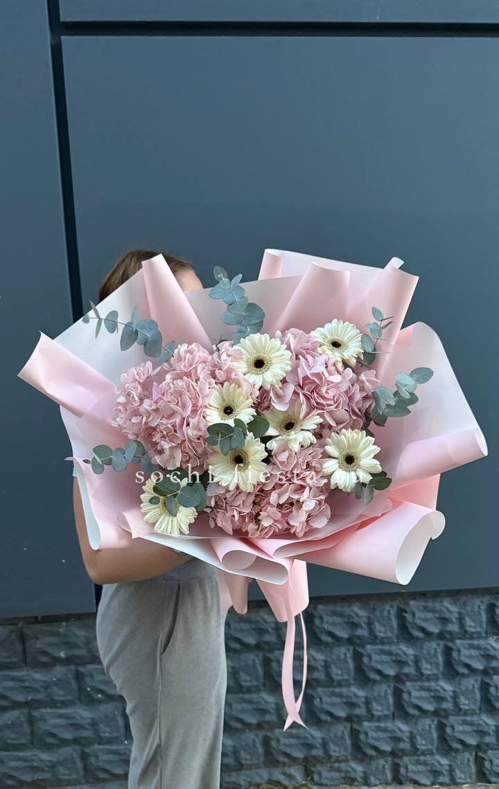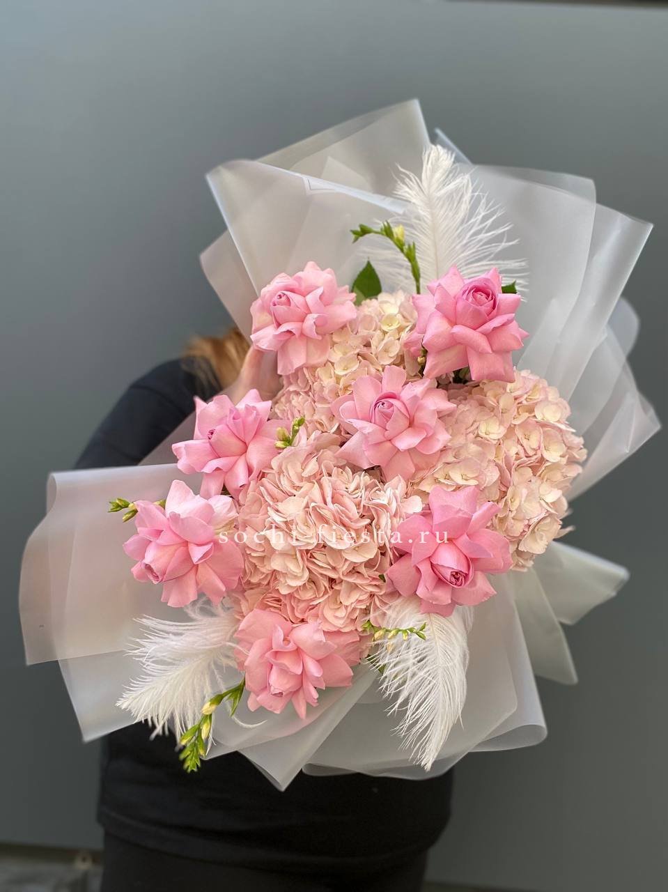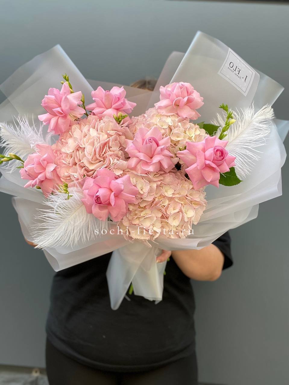 гортензия, французские (вывернутые) розы, лента, дизайнерская пленка, тишью.