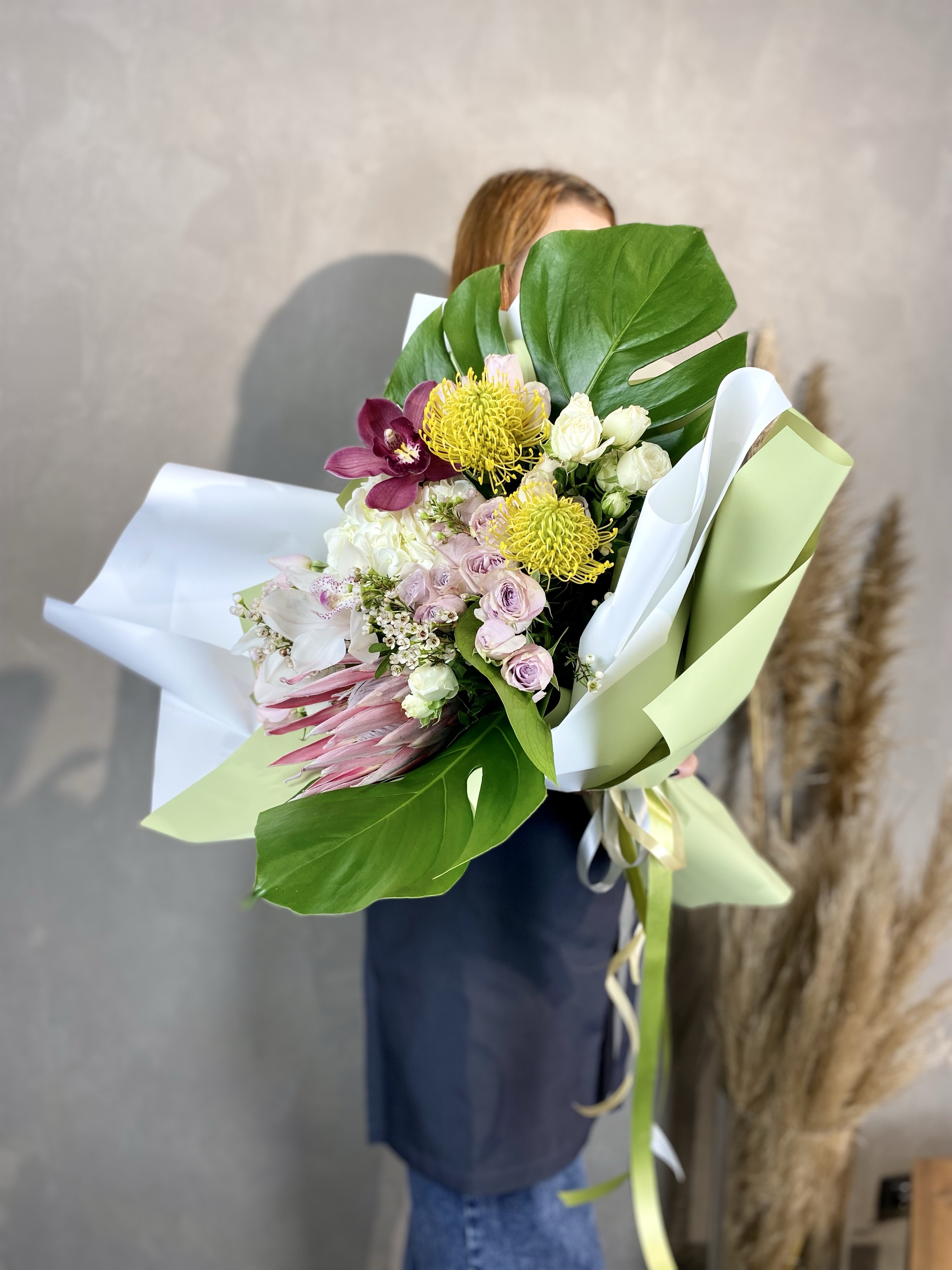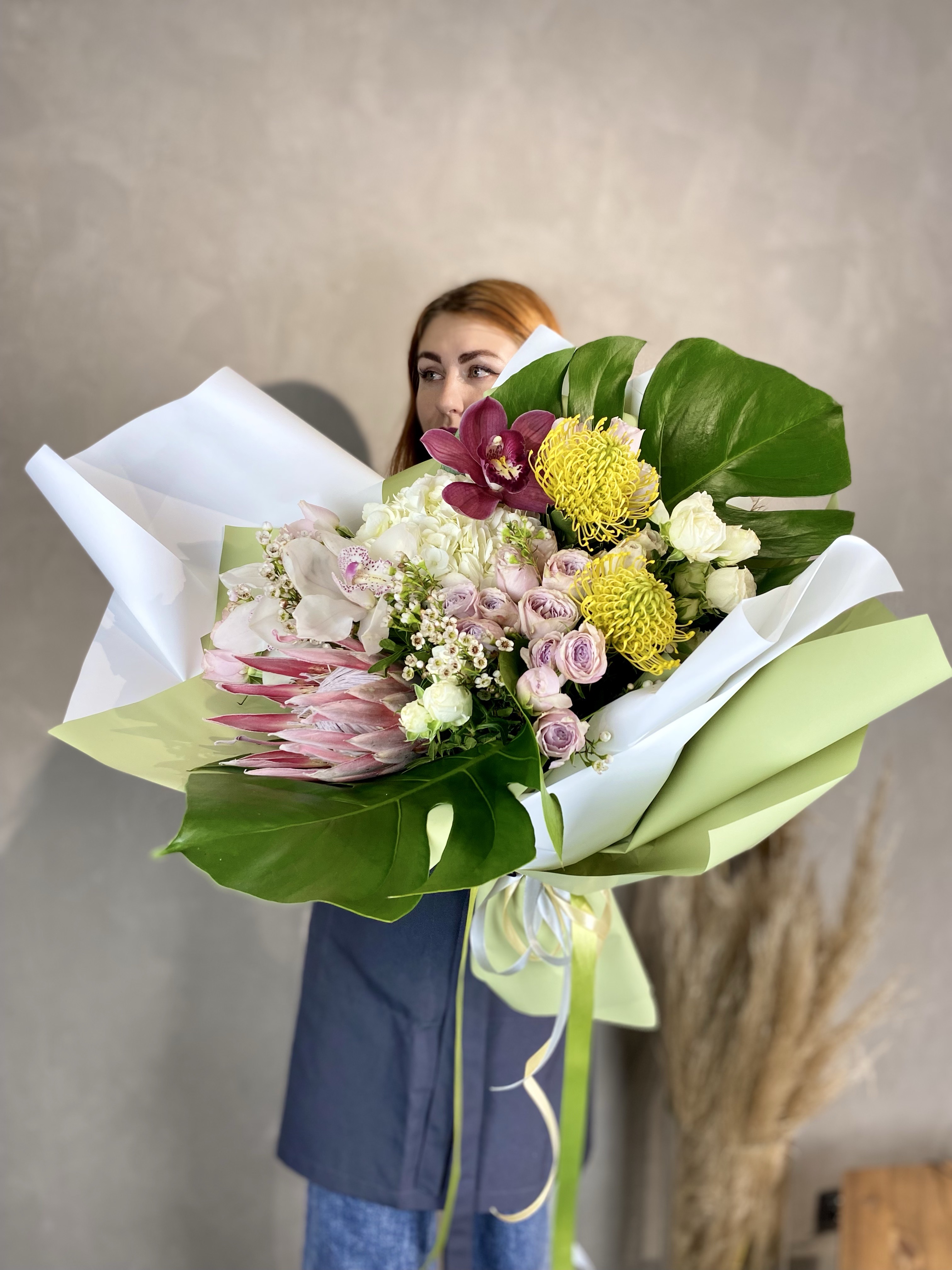протея, декоративная зелень в зависимости от сезона, дизайнерская упаковка.