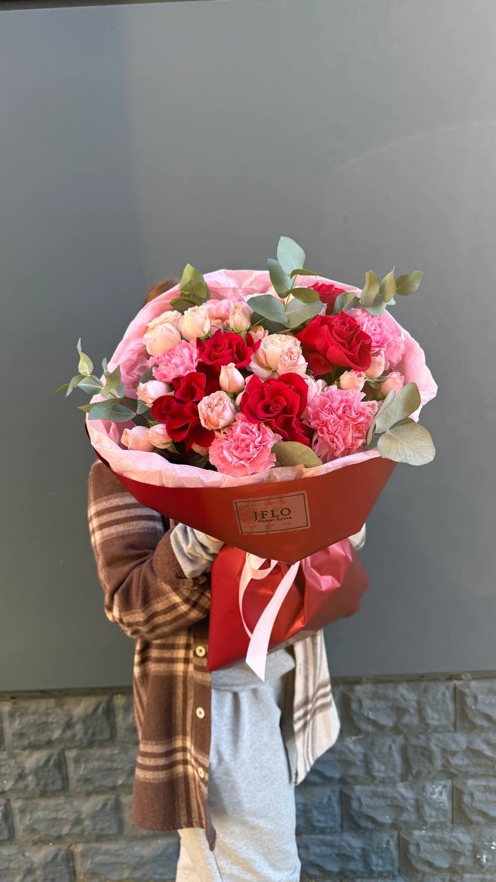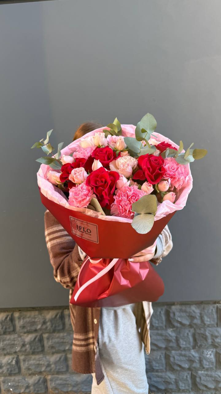 Розы и диантусы образуют лёгкий микс с выразительной игрой фактур. Эвкалипт добавляет графичности и свежести общей картине. Компактная сборка удобна для размещения на столе или комоде.