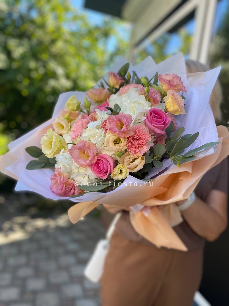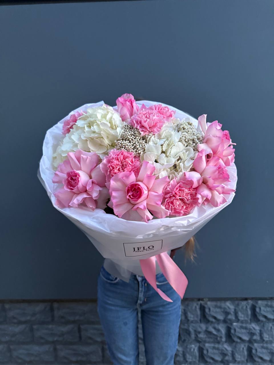 Пышные шапки гортензии задают объём, а россыпь кустовых роз создаёт живую текстуру по всей форме. Композиция наполнена воздухом и естественной лёгкостью.