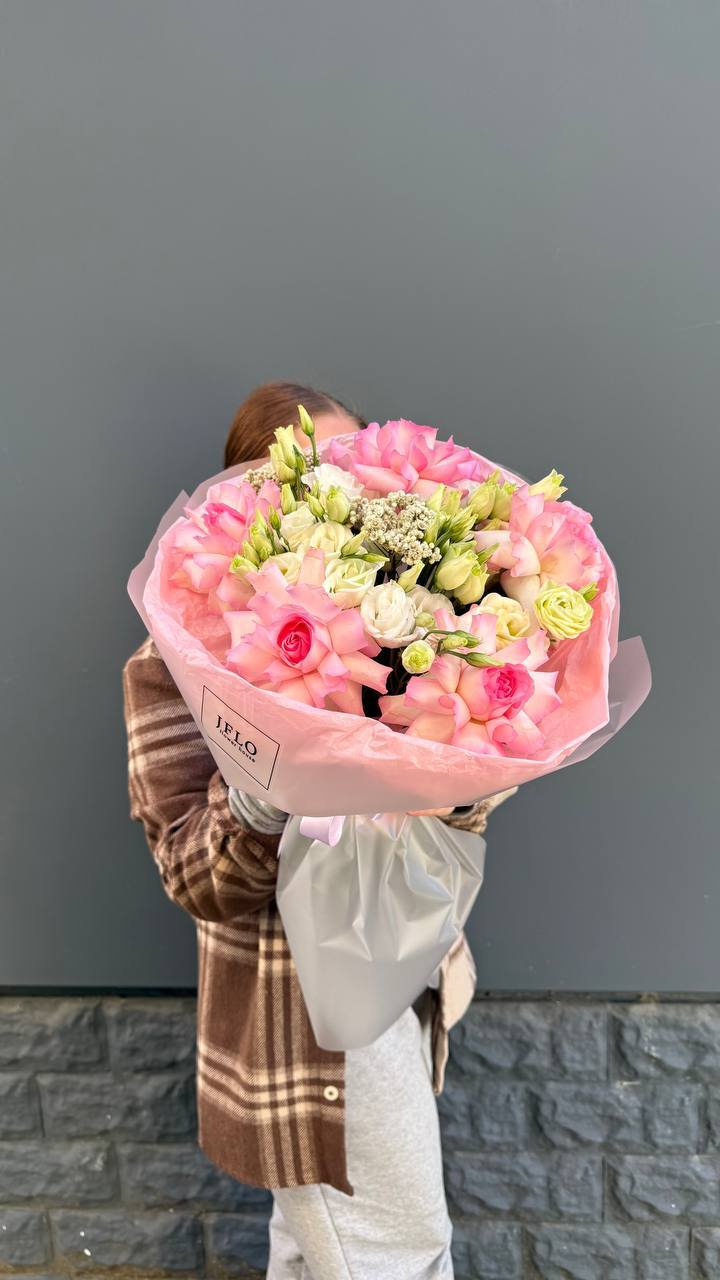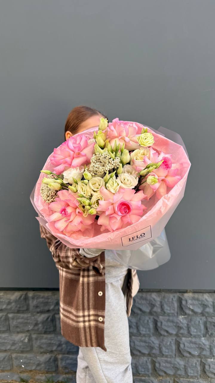 Розовые розы и диантусы окружены пышными соцветиями маттиолы и бомбастика. Композиция собрана плотно, каждый цветок поддерживает соседний, создавая объемную округлую форму. Букет держит силуэт и выглядит цельно с любого ракурса.