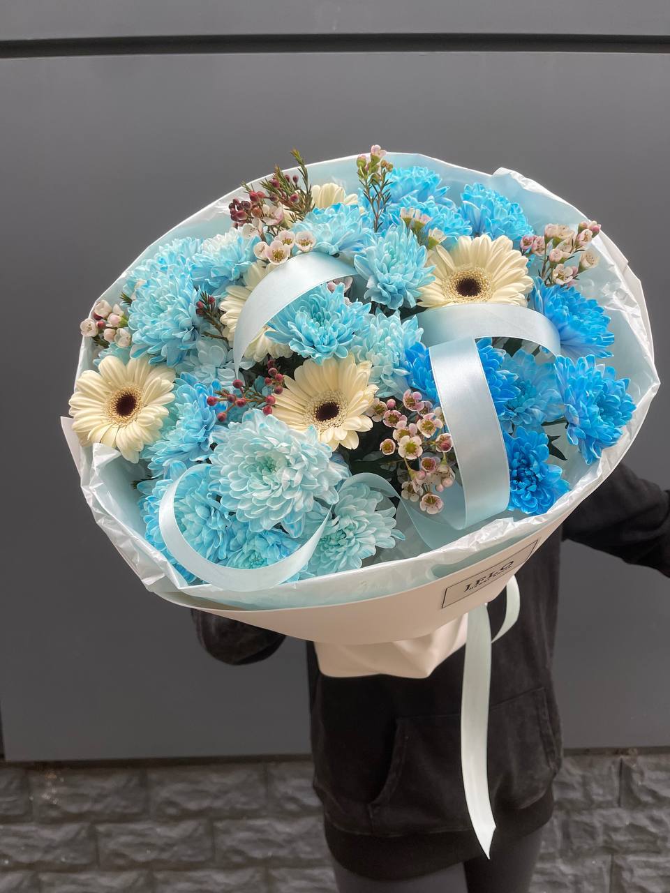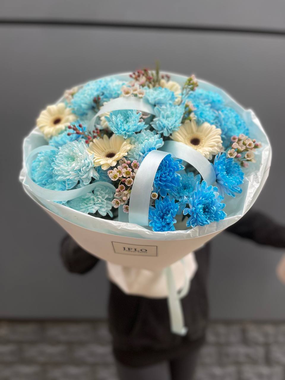 диантус, гербера, кустовая роза, роза белая, лимониум (замена в несезон), дельфиниум/маттиола/львиный зев/гладиолус (замена в несезон), лента, авторская упаковка.