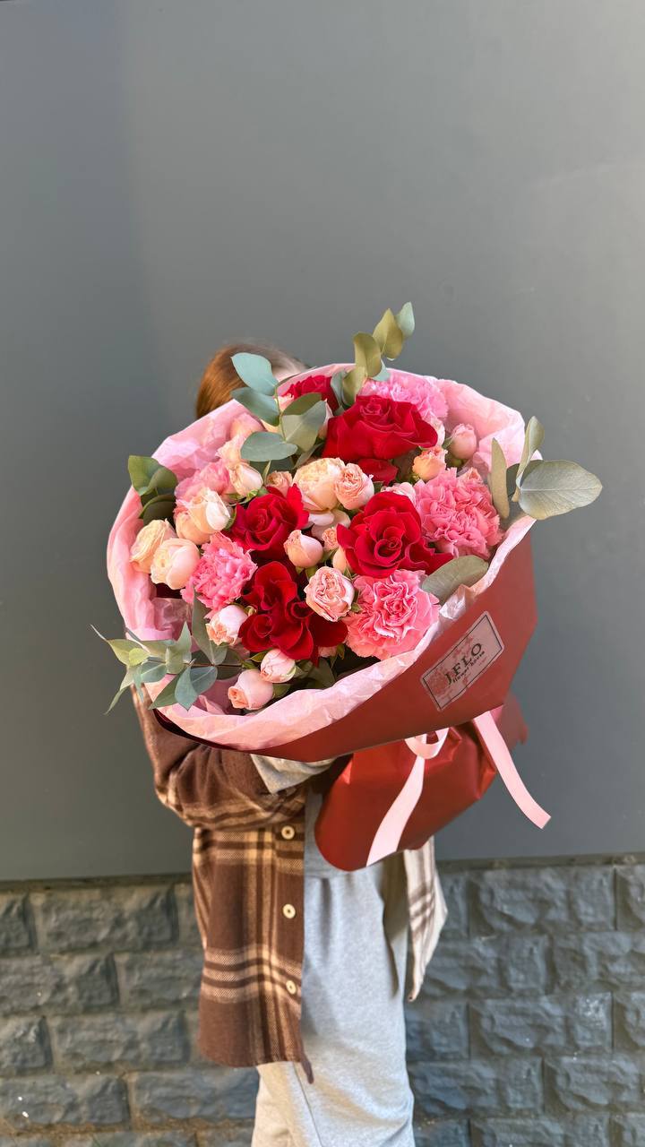 Пышный авторский микс, в котором глубокий красный цвет роз гармонично дополнен зефирными оттенками диантусов и кустовых роз. Это не просто букет, а масштабное признание, которое заставляет сердце биться чаще. Подарите незабываемый WOW-эффект той, кто вам по-настоящему дорога!