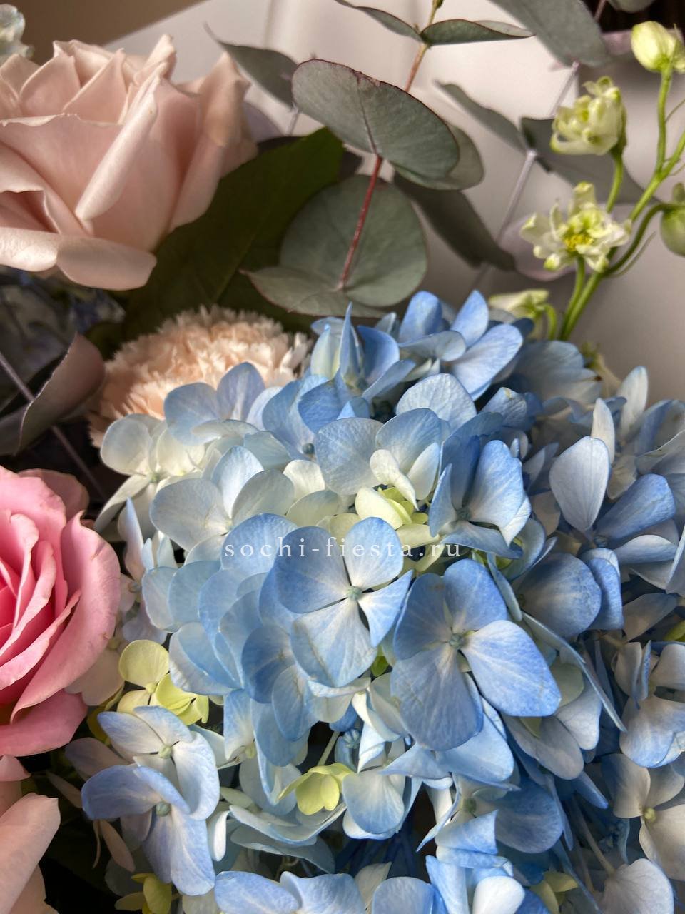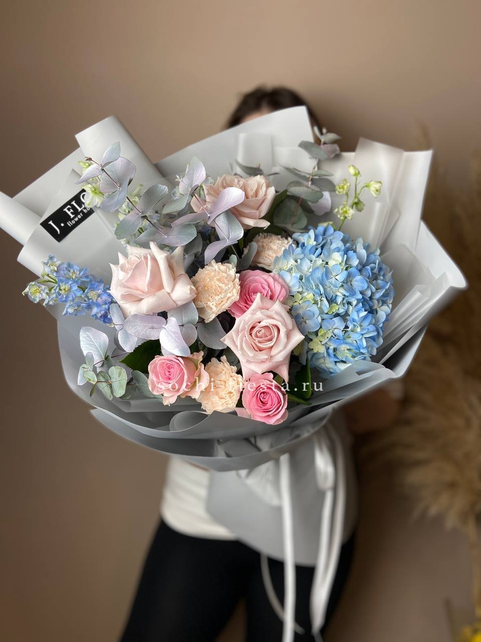 эвкалипт, гортензия, перо, кустовая роза, эустома, роза белая, диантус, упаковка.