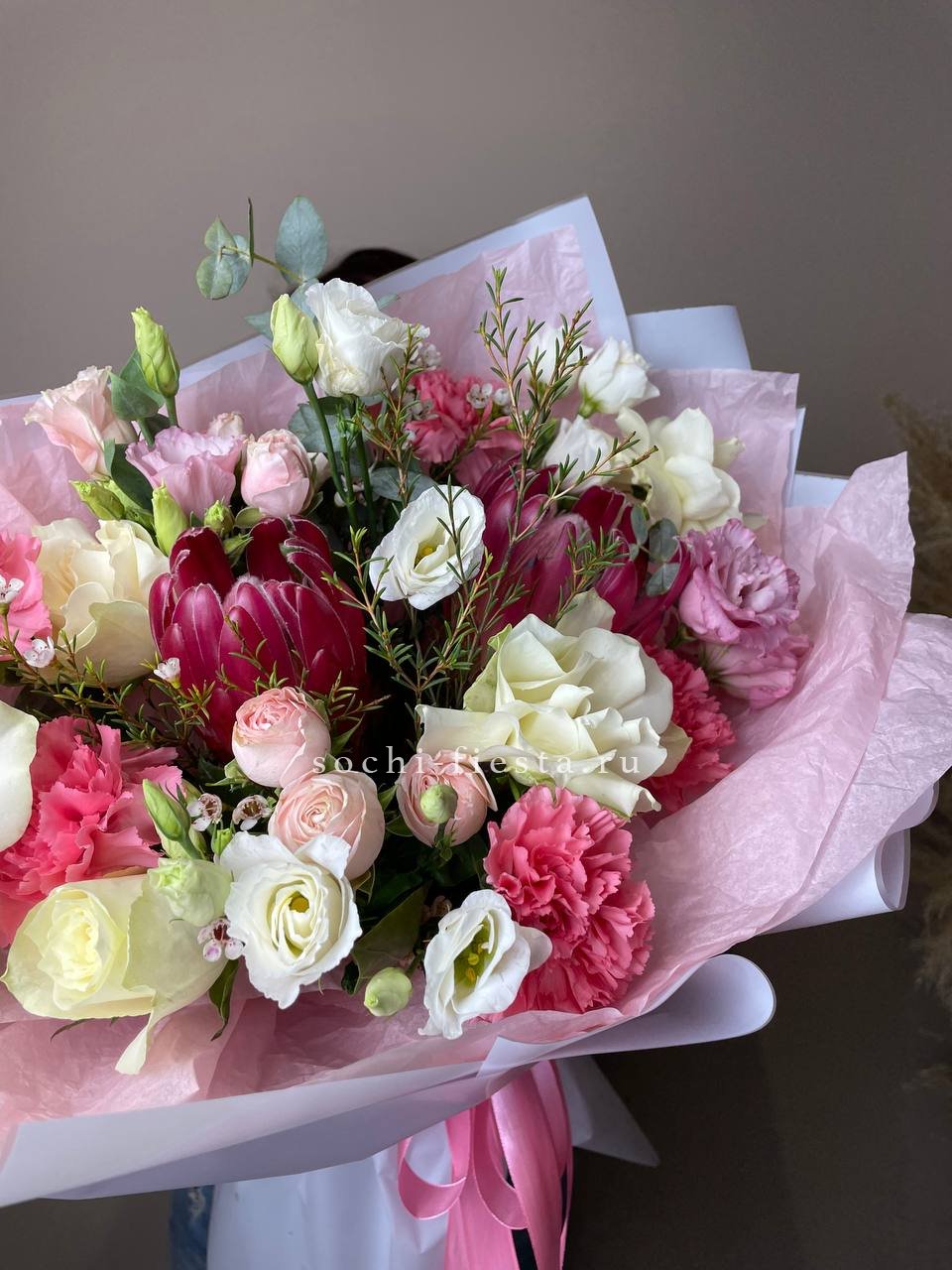 протея, эустома, роза, пионовидная роза, диантус, зелень декортивная, эвкалипт, оформление.