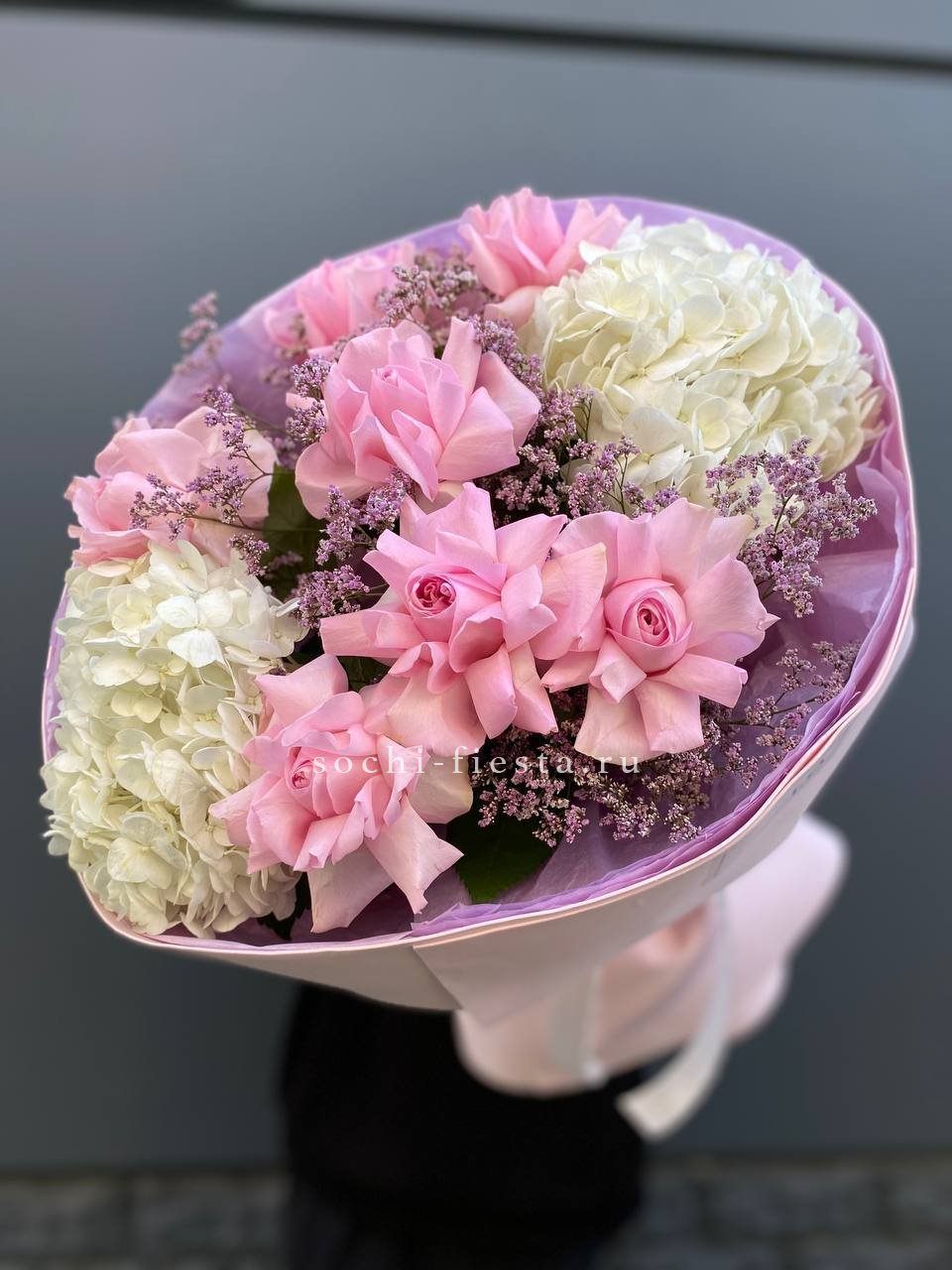 гортензия, розовые розы, кустовые розы, маттиолы,, лимониум лента и дизайнерская пленка.