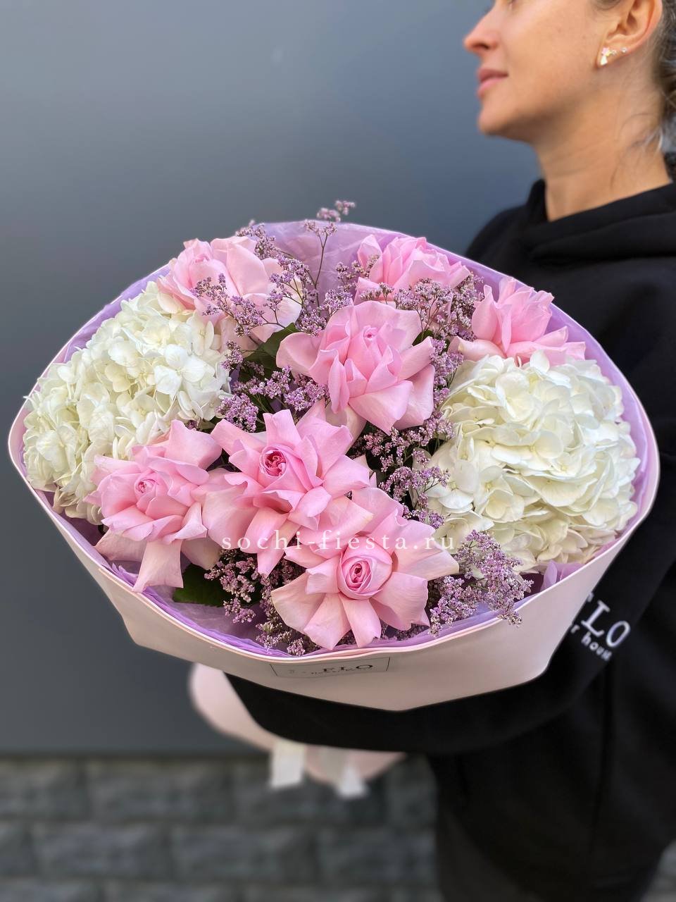 Воздушная гортензия окружена розовыми бутонами и душистой маттиолой. Лимониум добавляет букету лёгкую дымку, а общий силуэт остаётся мягким и собранным.