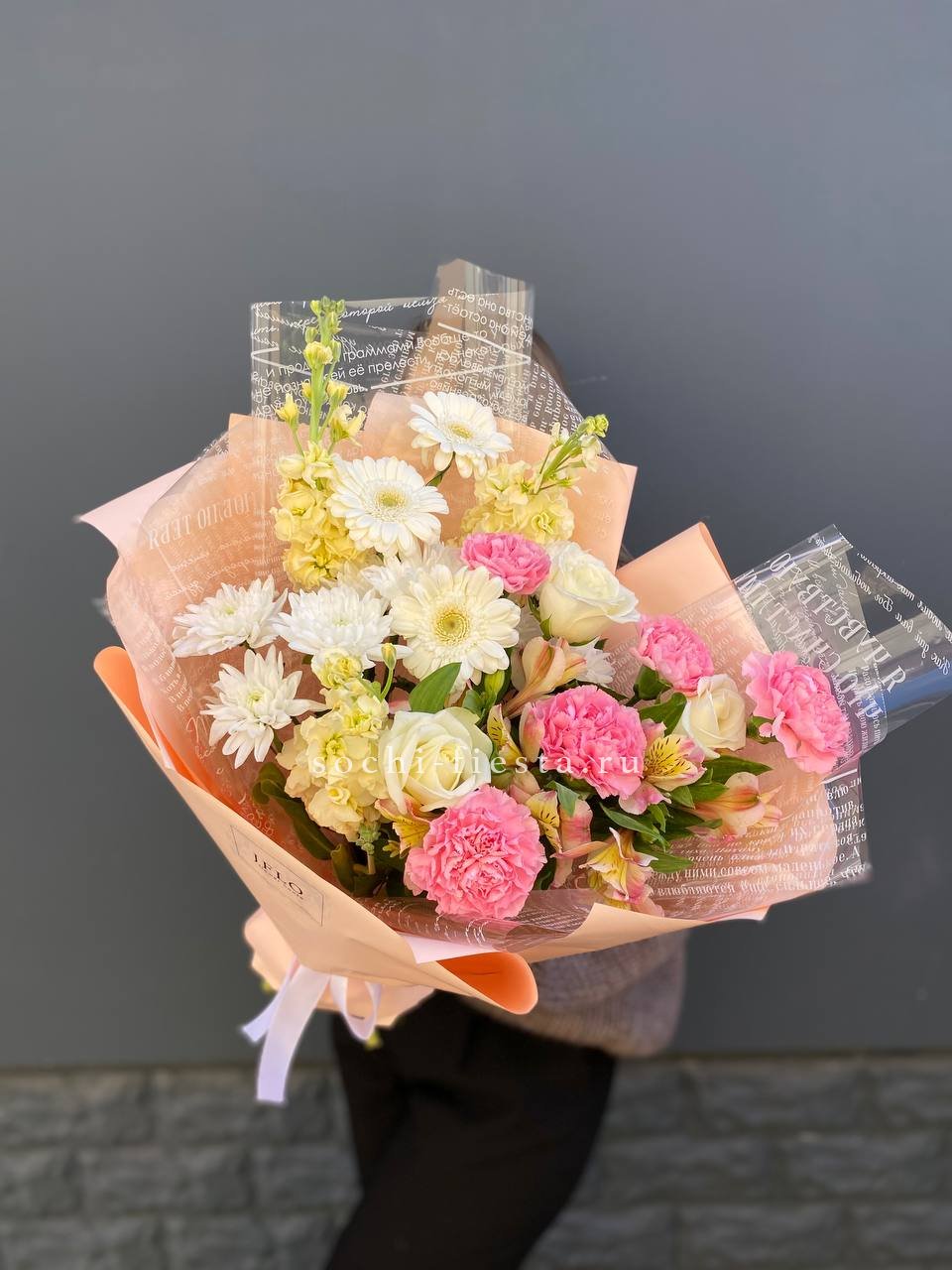 маттиола ,белые розы, хризантемы герберы, альстромерии, диантусы, лента и дизайнерская пленка.