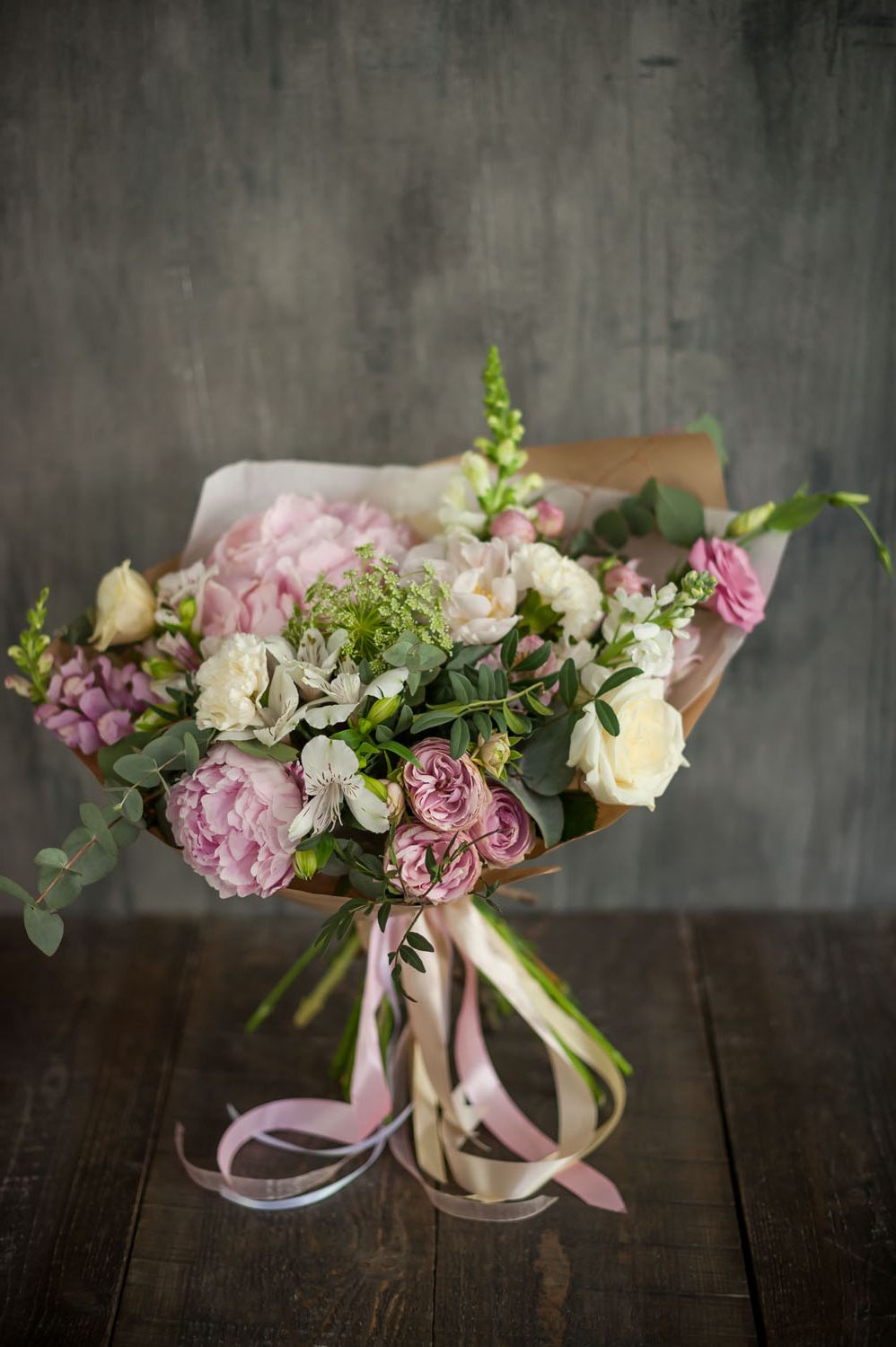 роза одноголовая, львиный зев (или аналог), пионовидная кустовая роза, альстромерия, диантус, гортензия розовая, пион, эвкалипт, декоративная зелень, лента, крафт.