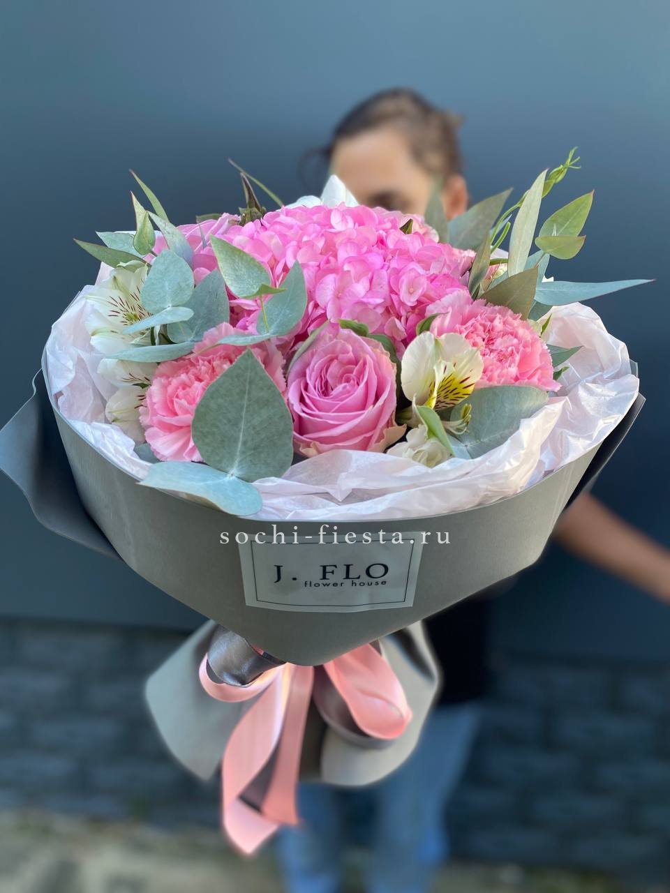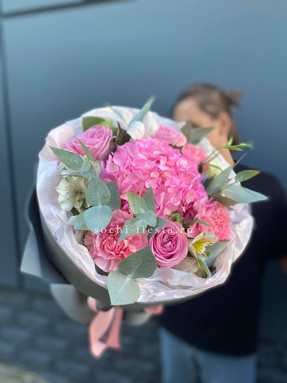 гортензия, диантус, кустовая пионовидная роза, эустома, вспомогательные цветы, эвкалипт, лента, дизайнерская упаковка.