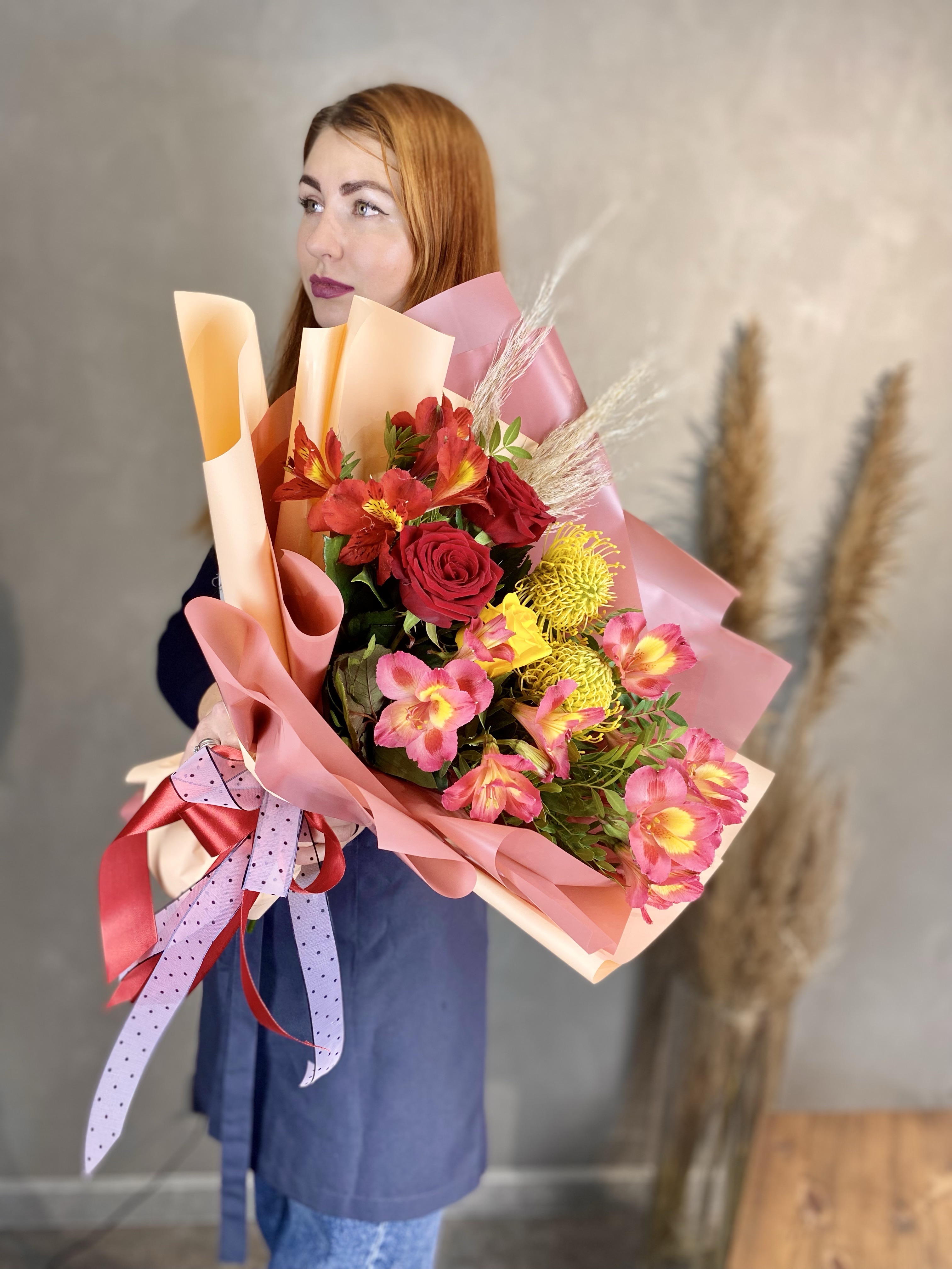 розы одноголовые, альстромерия, нутан, писташ, сухоцвет, лента, дизайнерская упаковка.