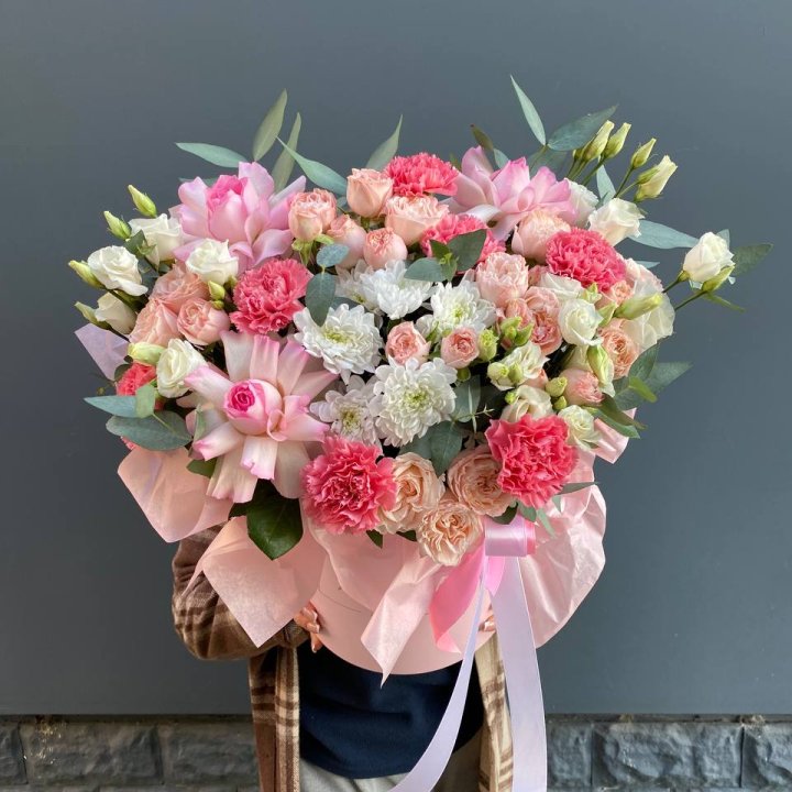 Сборка сезонной композиции идёт за 15-20 минут до выезда курьера. Это обеспечивает пиковую свежесть букета при вручении. Для свадебных и корпоративных партий — сборка в день доставки с ночным хранением в холодильнике.